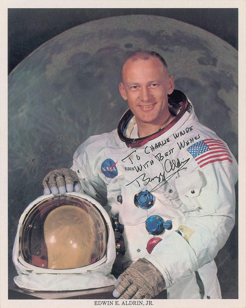 Official color 8 x 10 NASA lithograph of Aldrin posing in his white space suit against a lunar backdrop, signed and inscribed in black ink, "To Charlie Wride, with best wishes, Buzz Aldrin.” In fine condition, with a crease to the upper background.