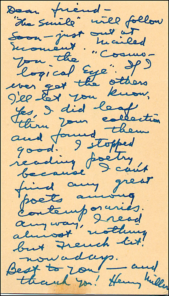 ALS on a 3.25 x 5.5 postal card, one page, no date but circa 1955. Letter to his friend Sheridan Van Dolah, in full, “'The Smile' will follow soon—just out at moment. Mailed you the ‘Cosmological Eye.’ If I ever get the others I’ll let you know. Yes, I did leaf thru your collection and found them good. I stopped reading poetry because I can’t find any good poets among contemporaries. Anyway, I read almost nothing but French lit. nowadays. Best to you—and thank you!” Reverse addressed in Miller's own hand, incorporating his signature in the upper left. In fine condition, with a small spot to bottom of postcard. Accompanied by Van Dolah’s letter of response and a letter from Miller’s wife, dated October 15, 1955.