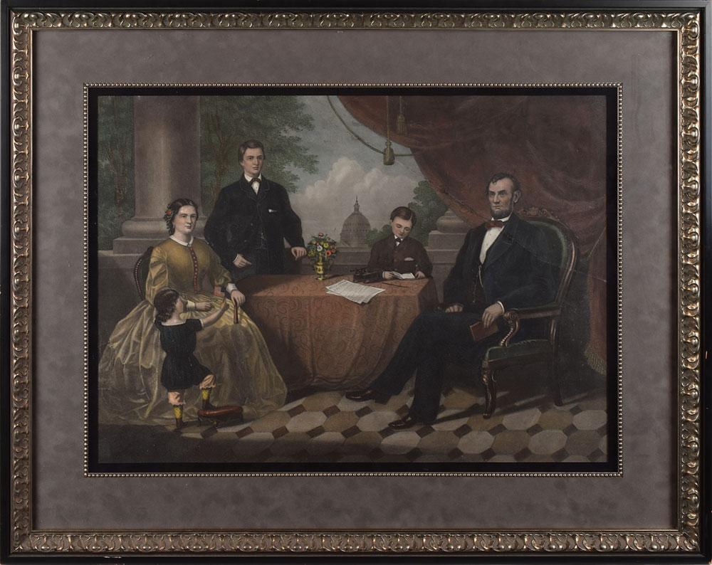 Uncommon color 24.5 x 17.75 lithograph of the Lincoln family gathered around a table, the dome of the Capitol building visible in the background, and a document headed "Proclamation Freedom" lain in front of President Lincoln. This seldom-seen version of the Lincoln family portrays Abraham and Mary surrounded by their three sons: Robert, Tad, and Willie. Impressively matted and framed to an overall size of 34 x 27. In very good to fine condition, with a repaired tear extending from the top center to the right center, which passes through Lincoln's bow tie.