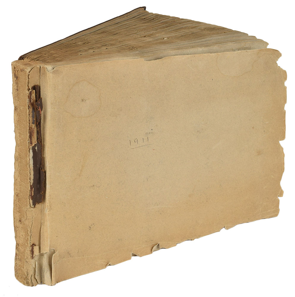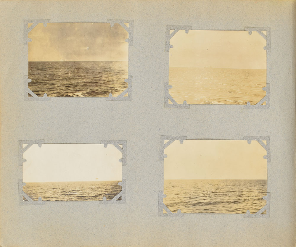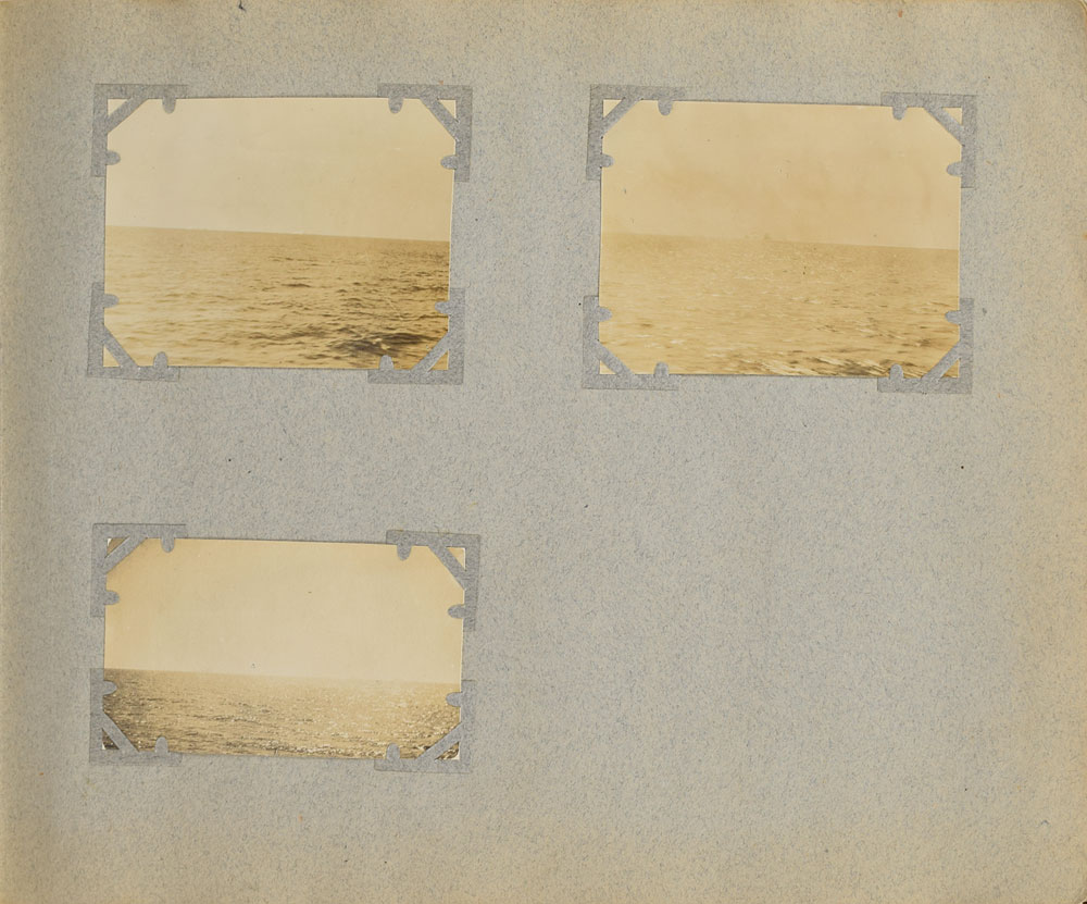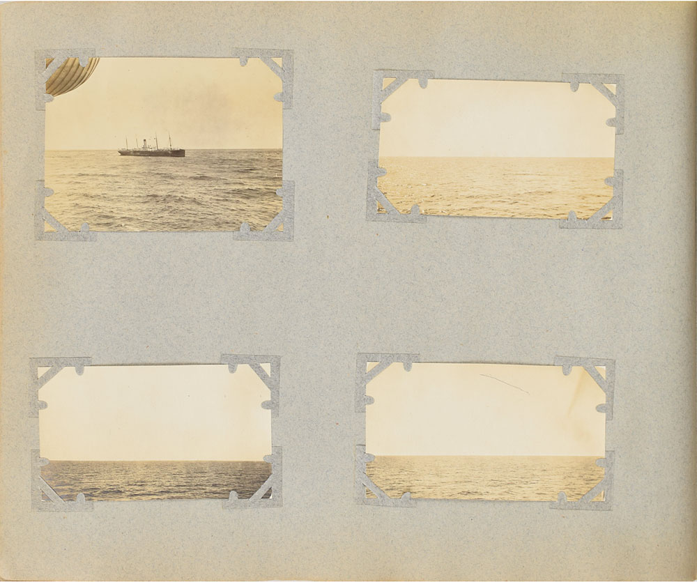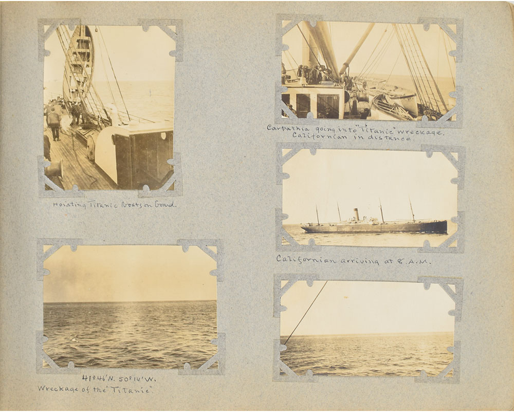 Incredible photograph album belonging to Louis M. Ogden, a New York socialite aboard the RMS Carpathia during the Titanic disaster who helped to photograph, document, and assist the survivors. The album consists of over 500 first-generation glossy and matte-finish photos, each removably corner-mounted and displayed on 12 x 10 album pages bearing handwritten ink notations by Ogden. The photographs document the globe-spanning expedition he and his wife Augusta took over the course of 1911 and 1912, visually recording their trips to Algiers, the Sahara, Spain, Italy, Argentina, Gibraltar, Switzerland, Greece, and Austria. The album is highlighted by an assortment of 50 photos, ranging in size from 2.75 x 3 to 4.75 x 6.75, which chronicle life aboard the Carpathia and the mid-April 1912 rescue of the Titanic survivors. While condition of the album itself is rough (missing spine and cover, fragile pages, etc), the photos themselves are in overall fine condition.