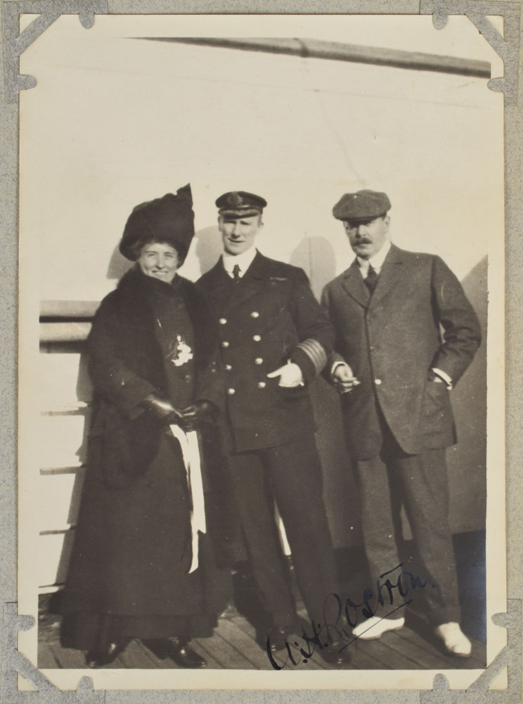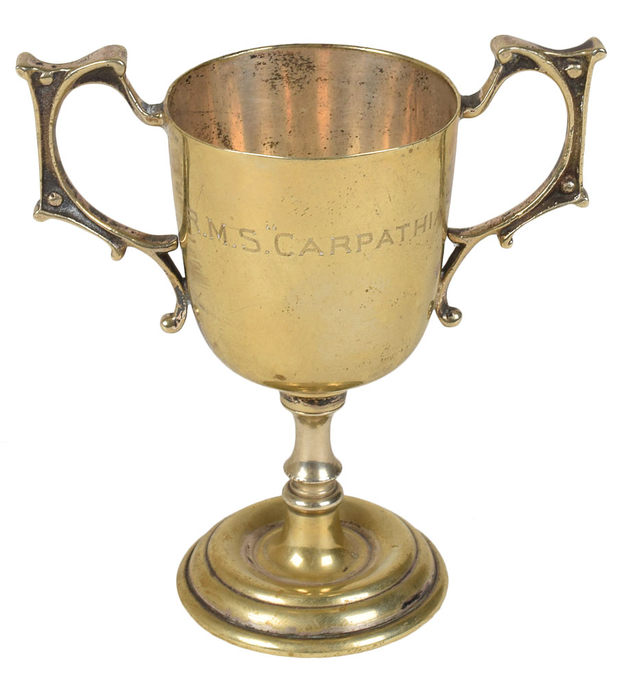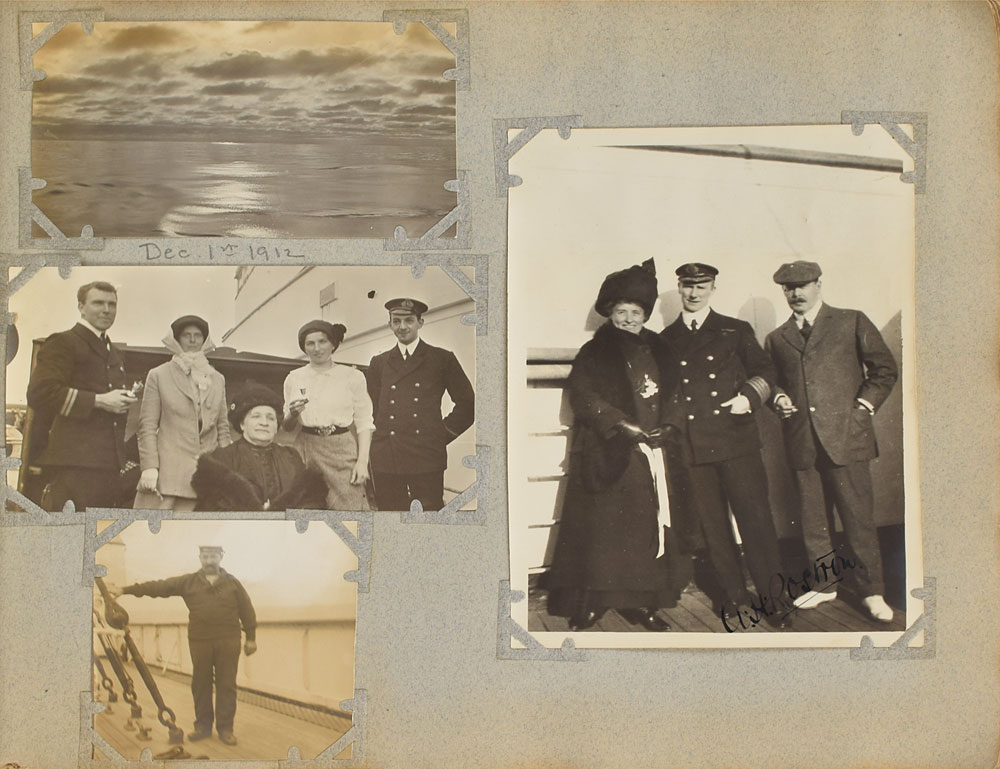 The most significant of the Carpathia and Titanic photos are found on six successive pages midway through the album, which Ogden has dedicated: “The Titanic Rescue, April 15th 1912.” The section features a total of 29 photos and includes images of the late arrival of the SS Californian, the approach and rescue of Titanic emergency lifeboats 1, 6, and 14, and an unprecedented assemblage of 11 photos of icebergs, with images depicting them floating both nearby and on the distant horizon of the North Atlantic; the first such photo captures the very peak responsible for sinking the Titanic, which Ogden has decreed as “The berg the Titanic struck, taken at sunrise.” Other notable photos feature various crew members and passengers of the RMS Carpathia, as well as several of Captain Arthur Rostron, two of which are signed by him in fountain pen, "A. H. Rostron," with one showing him posing with Ogden and his wife on the ship's deck. Also includes a miniature loving cup engraved on the front, "R. M. S. 'Carpathia.'" The first vessel to respond to and discover the lifeboats of the Titanic in the early hours of April 15th, the RMS Carpathia cautiously navigated through ice fields en route to its rescue of 705 survivors. A tremendous archive of first generation photos that not only documents the harrowing rescue, but likewise proffers an unprecedented assemblage of iceberg photographs—images of the two-peak Titanic iceberg are tremendously rare. A truly one-of-a-kind and museum-quality collection.