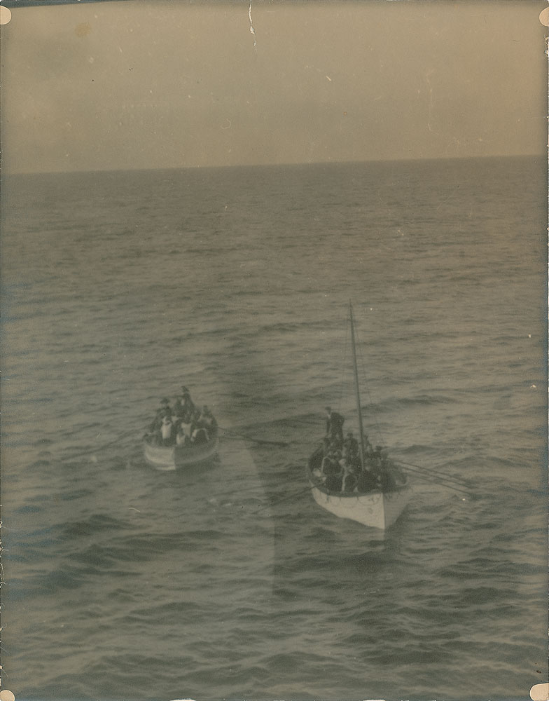 Large original 11 x 13.75 matte-finish photo of a pair of Titanic Emergency Lifeboats floating in the waters of the North Atlantic. The photograph, taken by Carpathia passenger Louis M. Ogden on the morning of April 15, shows Titanic Emergency Lifeboat No. 14 towing collapsible Lifeboat D to the RMS Carpathia. In fine condition, with a tear to the top edge. Ogden was a New York socialite aboard the Carpathia during the Titanic disaster who helped to photograph, document, and assist the survivors. This image, one of thirty he captured that day, was loaned by Ogden to Titanic survivor Archibald Gracie, a passenger on Lifeboat 12, who had the photo enlarged to use while writing his book The Truth About the Titanic, which was published posthumously in 1913.