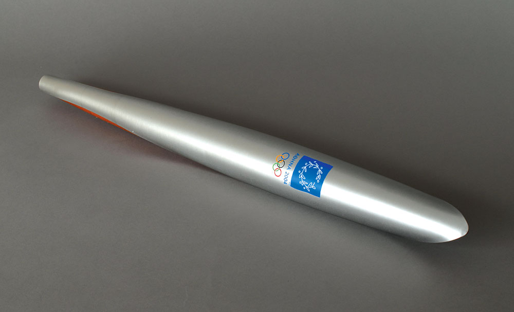 New, never burned official 2004 Athens Summer Olympics torch, constructed of aluminum and olive wood, measuring 25.75″ in length and 2.25″ at its widest point, designed by Andreas Varotsos and manufactured by GA & L Harrington. The torch was modeled to reflect the simple and congruous lines of an olive tree leaf, with the union of wood and metal evoking the different colors found on either side of the leaf, and the ergonomic design representing the extension of the moving flame. The front of the aluminum sheath bears the Olympic rings and Athens emblem. The Olympic flame was lit in Olympia, Greece, on March 25, 2004, and proceeded on a five continent journey that witnessed the torch pass by all the cities that had hosted the Games since 1896, as well as marking the flame's debut in Africa, India and South America. In total, the torch covered over 84,000 km during its 141 day journey. This elegant torch includes its original shipping tube.