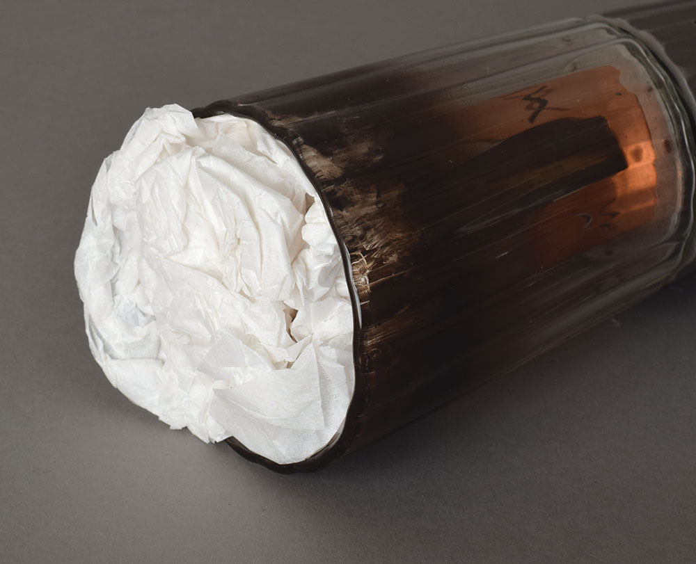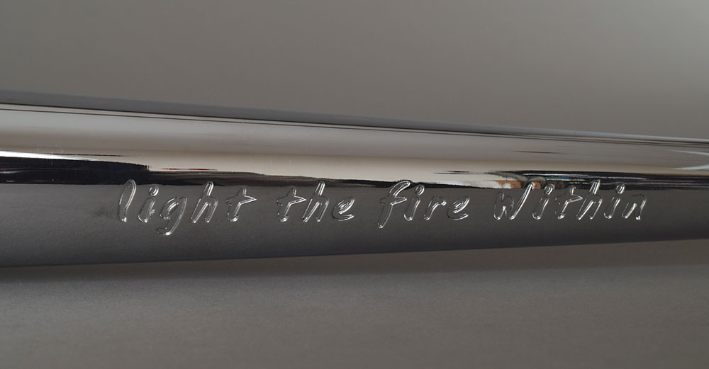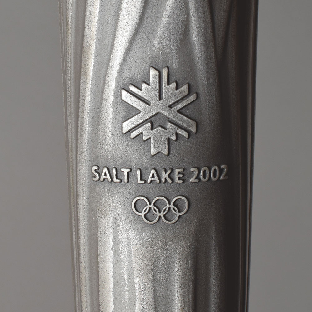 Official 2002 Salt Lake City Winter Olympics torch, constructed of silvered metal, copper, and glass, measuring 32.5″ in length and 3.5″ at its widest point, designed by Axiom Design and manufactured by Coleman. The torch was modeled after an icicle and slightly curved to represent speed and fluidity, with a contrasting dull and polished finish on the handle to represent the meeting of modernity with the past. The handle is engraved with the motto of the games, "Light the fire within," and a raised emblem of the games appears near the top. The crystal bowl exhibits burn marks from use. The Olympic flame was lit in Olympia, Greece, on November 19, 2001, and began the American leg of its journey on December 4 in Atlanta. The route passed through the past host cities in the United States—Atlanta, Lake Placid, St. Louis, Los Angeles, and Squaw Valley—over a 21,725 km route.