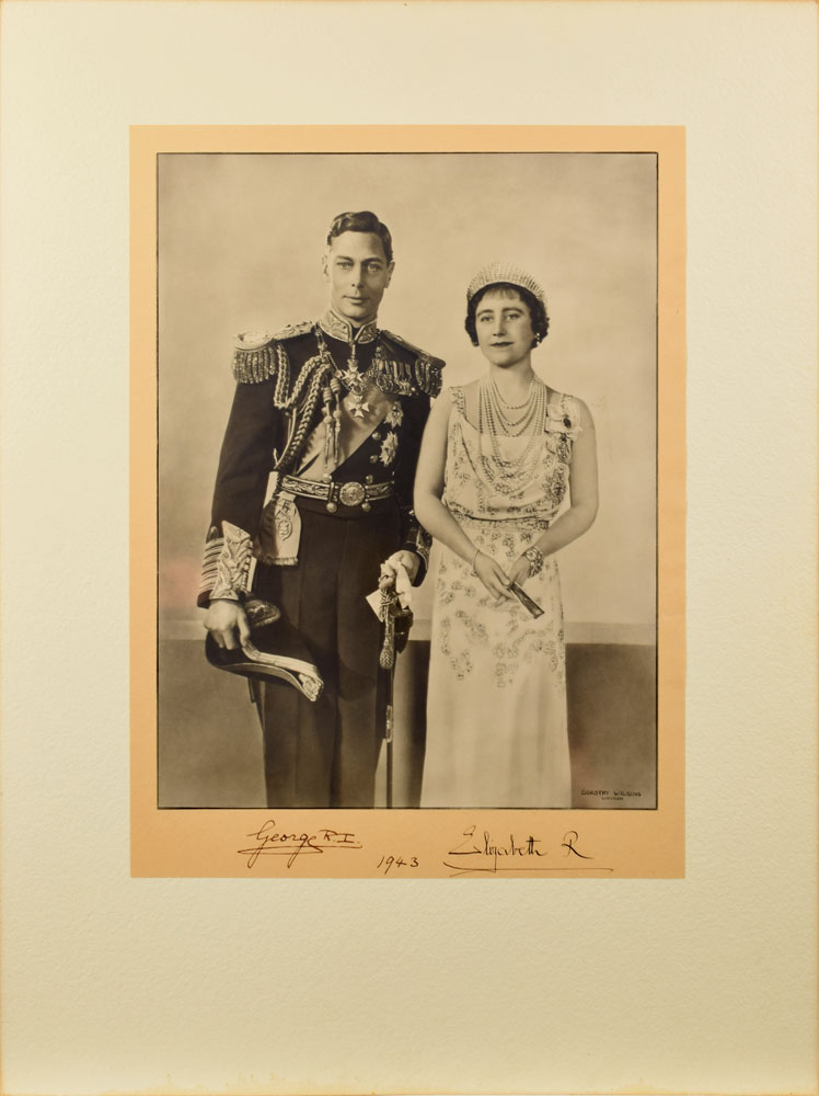 Superb vintage matte-finish 11 x 14.25 three-quarter-length portrait of King George and Queen Elizabeth by Dorothy Wilding, affixed to the original 18 x 24 mount, signed on the mount in fountain pen, "George R. I., 1943," and in black ink, "Elizabeth R." Reverse of mount bears a Wilding studio label, numbered "09382R." In very fine condition. Only the fifth signed photo of George and Elizabeth that we've ever offered, and by far the largest and most striking.