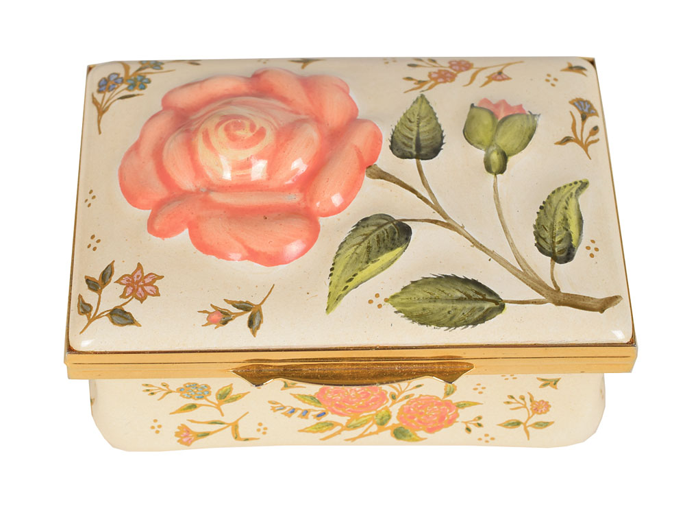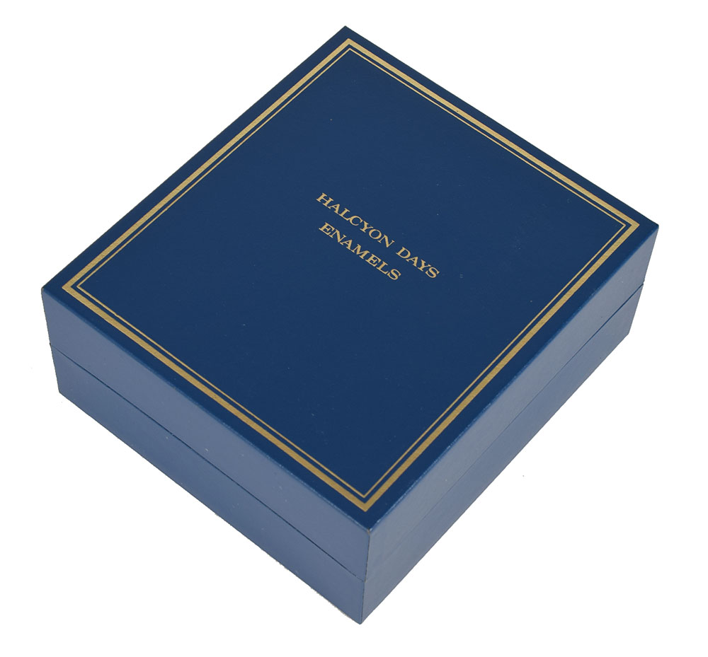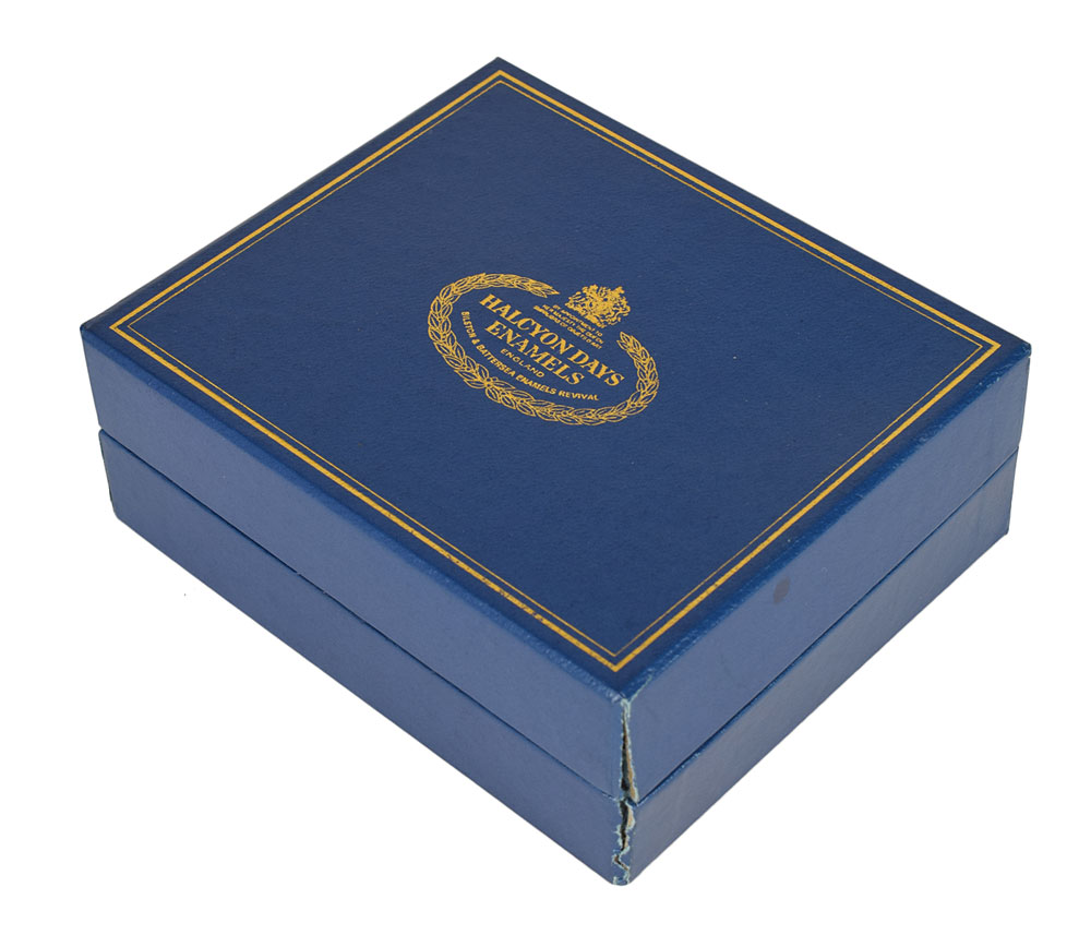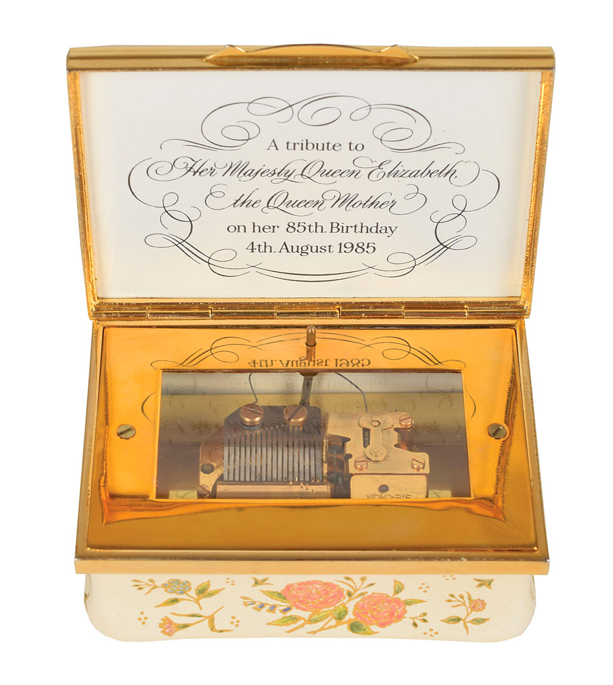 Two small limited edition enameled boxes made by Halcyon Days in Bilston, England: a music box commemorating the Queen Mother's 85th birthday on August 4, 1985, measuring 3 x 2 x 1.5, numbered 184/250, which plays Chopin's 'Grande Valse Brillante' when opened; and a trinket box featuring Andy Warhol's 1985 portrait of Queen Elizabeth II, measuring 2 x 2 x 1, numbered 141/500. In overall fine condition. Accompanied by the original boxes and certificates of authenticity. Also accompanied by a 14 x 20 silk program for the tribute to the Queen Mother at the Royal Opera House, Covent Garden, for her 80th birthday on August 4, 1980.