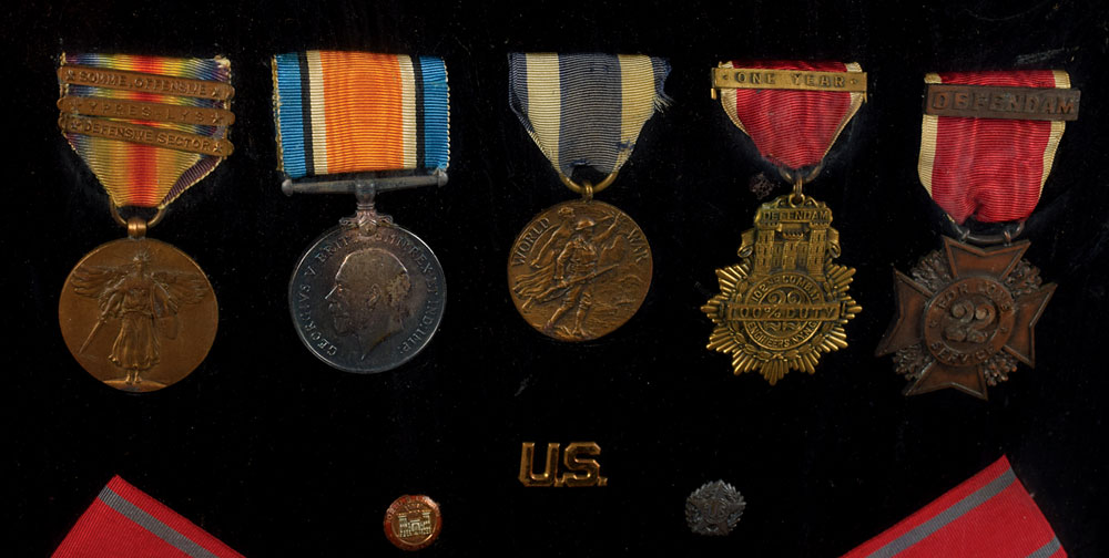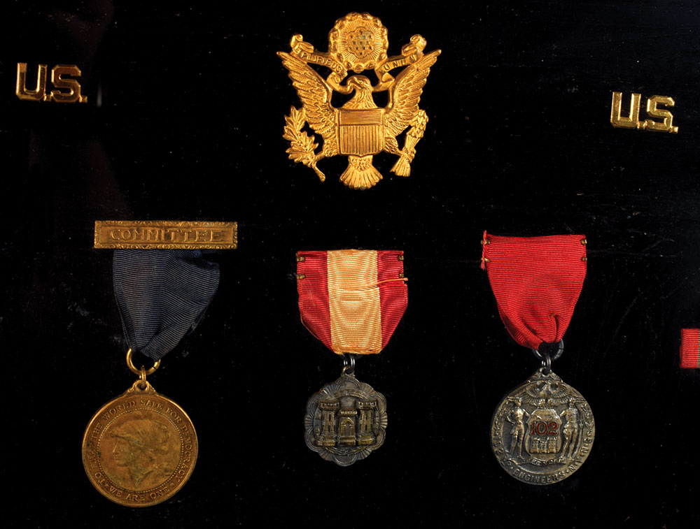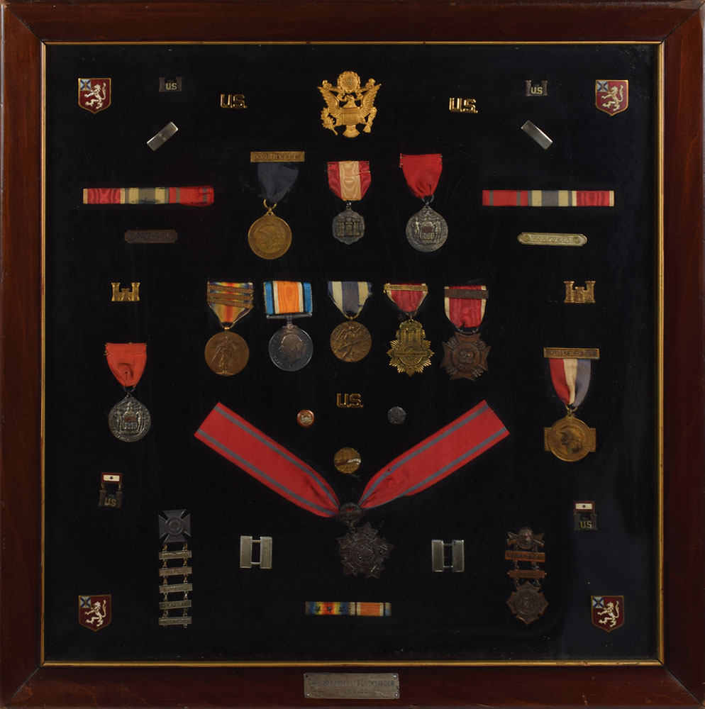 Impressive display of the WWI-era military service medals of Captain Lawrence A. Dockstader, framed to an overall size of 22.5 x 22.5. Among those included are: a US World War I Victory Medal with clasps for “Somme-Offensive,” “Ypres-Lys,” and “Defensive Sector”; a WWI British War Medal; two “To Make the World Safe for Democracy” medals, one with a “Committee” badge and one with a “Guest” badge; badges of the 102nd Engineer Battalion; various Engineer Corps pins and medals; marksman badges; ribbons; and various others. In overall very good to fine condition.