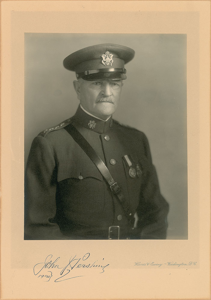 Vintage matte-finish 7.25 x 9.25 Harris & Ewing portrait of Pershing in his military uniform, affixed to the original 9.5 x 13.5 studio mount, signed on the mount in black ink, "John J. Pershing, 1940." In fine condition.