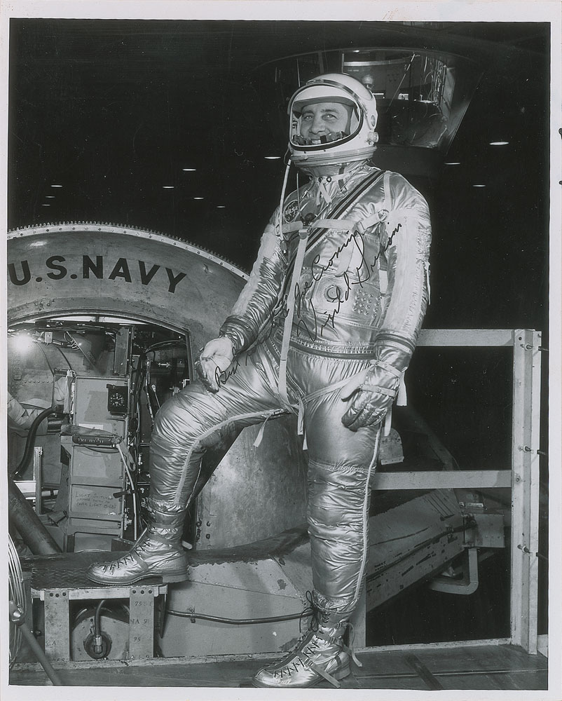 Exceptional vintage glossy 8 x 10 photo of Grissom posing in his Mercury suit prior to a training run in the original 'Mercury 7 Gondola' of the Johnsville Centrifuge, signed and inscribed in black ink, "Best wishes to Joe Cronin, Virgil I. Grissom.” In fine condition, with scattered light creasing.