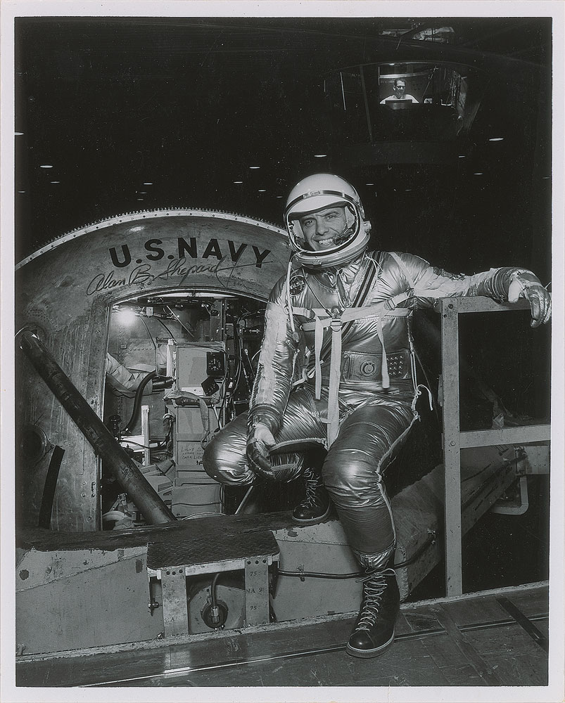 Vintage glossy 8 x 10 photo of Shepard wearing his Mercury suit prior to a training run in the original 'Mercury 7 Gondola' of the Johnsville Centrifuge, signed in black ink, "Alan B. Shepard, Jr." In fine condition.
