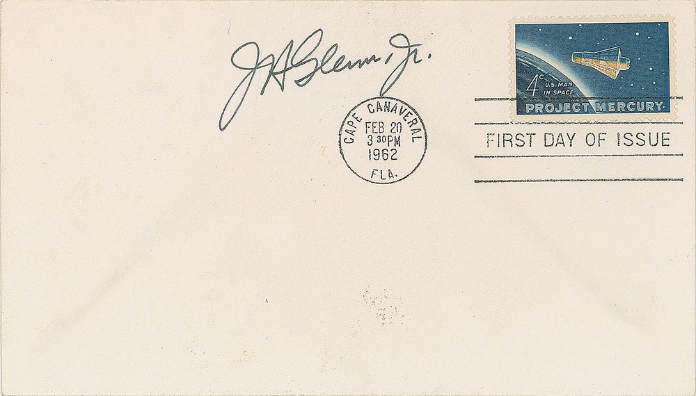 FDC postmarked February 20, 1962, the launch day of the Friendship 7 spacecraft, signed in black ink, "J. H. Glenn, Jr." In fine condition.