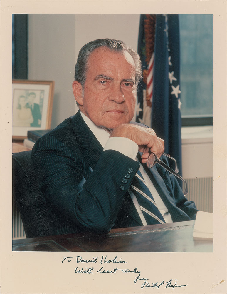Color semi-glossy 8.5 x 11 photo of Nixon sitting at his desk, signed and inscribed in the lower border in thin black felt tip, "To David Hobin, With best wishes, from, Richard Nixon.” In fine condition, with scattered light creasing.