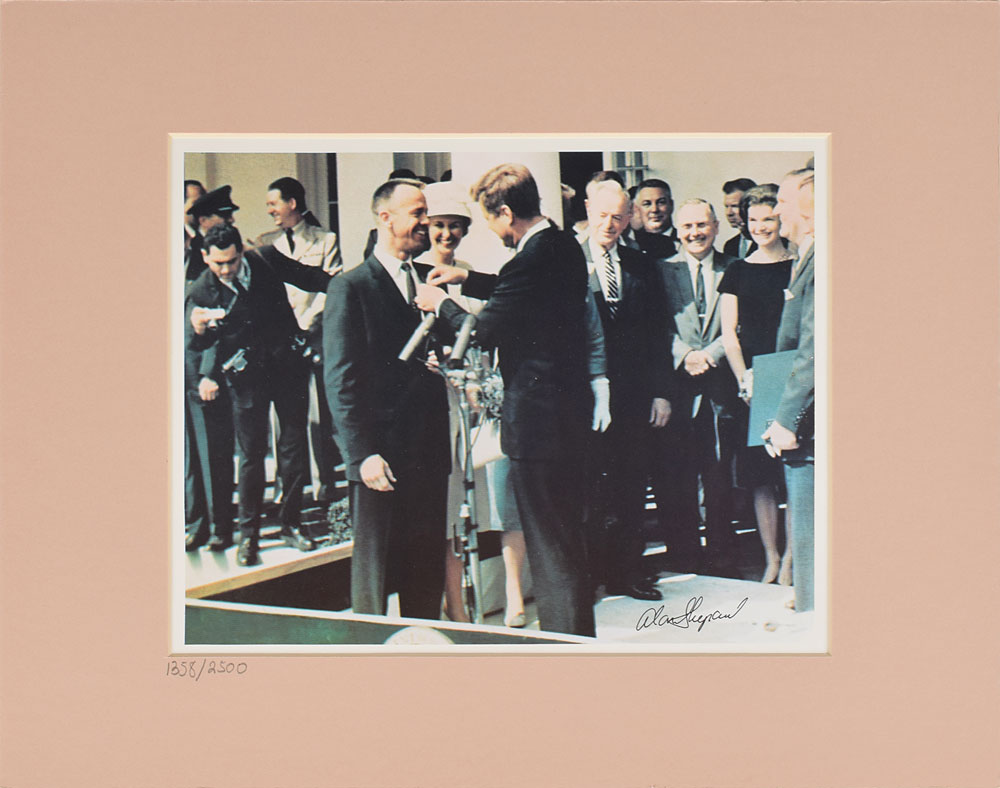 Limited edition color semi-glossy 9.25 x 7.25 cardstock photo of Shepard receiving the NASA Distinguished Service Medal from President Kennedy on May 8, 1961, numbered 1358/2500, signed in black ink by Shepard. Matted to an overall size of 14 x 11. In fine condition. Accompanied by a numbered authentication sheet.