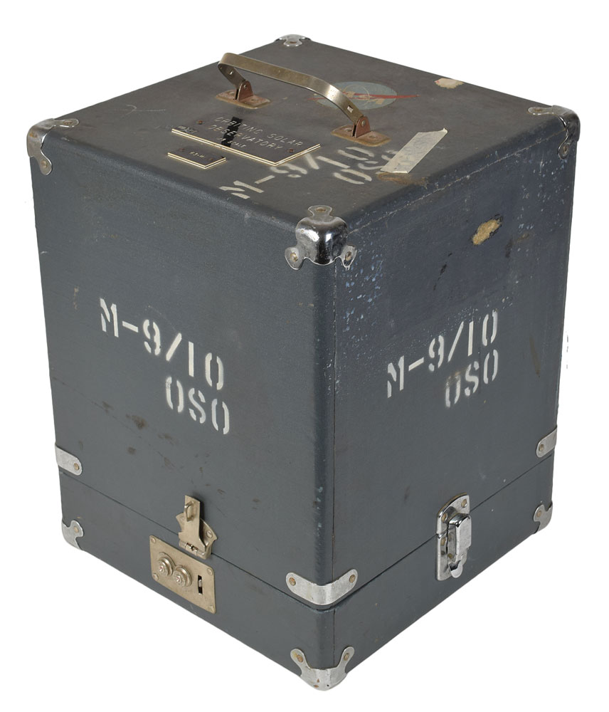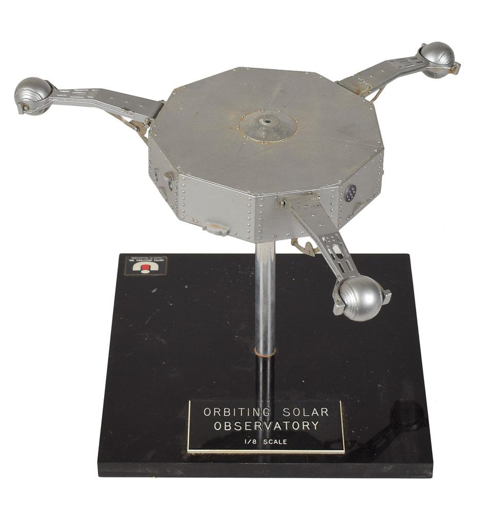 Rare 1:8 scale model of the Orbiting Solar Observatory, used by NASA as part of an outreach program during the late 1960s and early 1970s. The model measures approximately 10.25″ tall and features the stabilized solar oriented sail, spinning wheel portion, and three spin jet supply tanks. The capsule is set upon a black 8 x 8 base bearing an engraved plaque and manufacturing label, "United Industries, Inc., Everett 49, Massachusetts." Includes its original wooden 11 x 14 x 11 storage box, with white stenciling to the top and four sides: "M-9/10, OSO." The top of the box features a metal carrying handle, a NASA 'meatball' logo sticker, and two descriptive plaques: "Orbiting Solar Observatory, 1/8 Scale" and "63-MI." The interior of the storage box features a wooden support structure for the model, which bears felt tip notations: "OSO, M-9/10," and the model base can be secured by wing nut plates. In very good condition, with expected wear from use and storage, including: scattered scuffing and stains; original foam padding almost entirely disintegrated; sail no longer attached, but capable of repair; and supply tank arm pins missing, but again could be easily replaced and/or fixed. The OSO Program was a series of eight American space telescopes launched into Low Earth orbit by NASA between 1962 and 1975 using Delta rockets, with a primary mission of observing an 11-year sun spot cycle in UV and X-ray spectra. In the mid 1960s, the Advanced Orbiting Solar Observatory (AOSO) program was developed as a more advanced version: a polar-orbiting satellite system that would continuously monitor the Sun and surrounding environment; the AOSO program was canceled in 1965 due to budget constraints. Due to the size, weight and/or fragility of this item, special care will be taken when shipping this item. Please contact [email protected] for a quote.