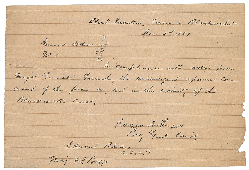 Newspaper editor and fiery secessionist orator (1828-1919) who served as a general in the Civil War. Manuscript DS, signed “Roger A. Pryor,” one page, lightly lined, 7.75 x 5.25, December 2, 1862. Headed, “General Orders No. 1,” the document reads, in full: “In compliance with orders from Major General French, the undersigned assumes command of the forces on, and in the vicinity of the Blackwater River.” In very good condition, with creasing, a small hole, and paper loss to the lower right edge.