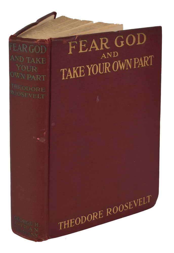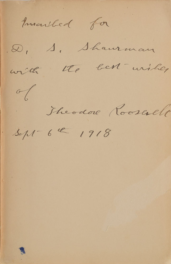 Signed book: Fear God and Take Your Own Part. First edition. New York: George H. Doran Company, 1916. Hardcover, 5.75 x 8.25, 414 pages. Signed and inscribed on the first free end page in black ink, “Inscribed for D. S. Shaurman, with the best wishes of Theodore Roosevelt, Sept 6th, 1918.” Autographic condition: fine, with a small blue stain near the bottom of the signed page. Book condition: VG-/None, with a cracked front hinge (with attempted tape repair), and bumps to edges.