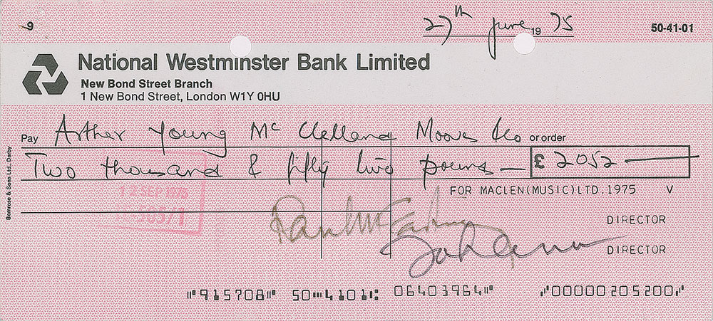 Sought-after Maclen (Music) Ltd. business check, 8 x 3.5, filled out in another hand and prominently signed by Lennon and McCartney as company directors, payable to Arthur Young McClelland Moores & Co., for £2052, June 27, 1975. In fine condition. Maclen Music was the company through which Lennon and McCartney received songwriting royalties for the songs they wrote together during the Beatles days. Both were well into their solo careers by this point, with both releasing albums in 1975—McCartney’s Wings came out with their fourth album, Venus and Mars, and Lennon released his sixth, Rock 'n' Roll. Post-Beatles material signed by both Lennon and McCartney are extremely scarce, with this example augmented by large, ideal signatures.