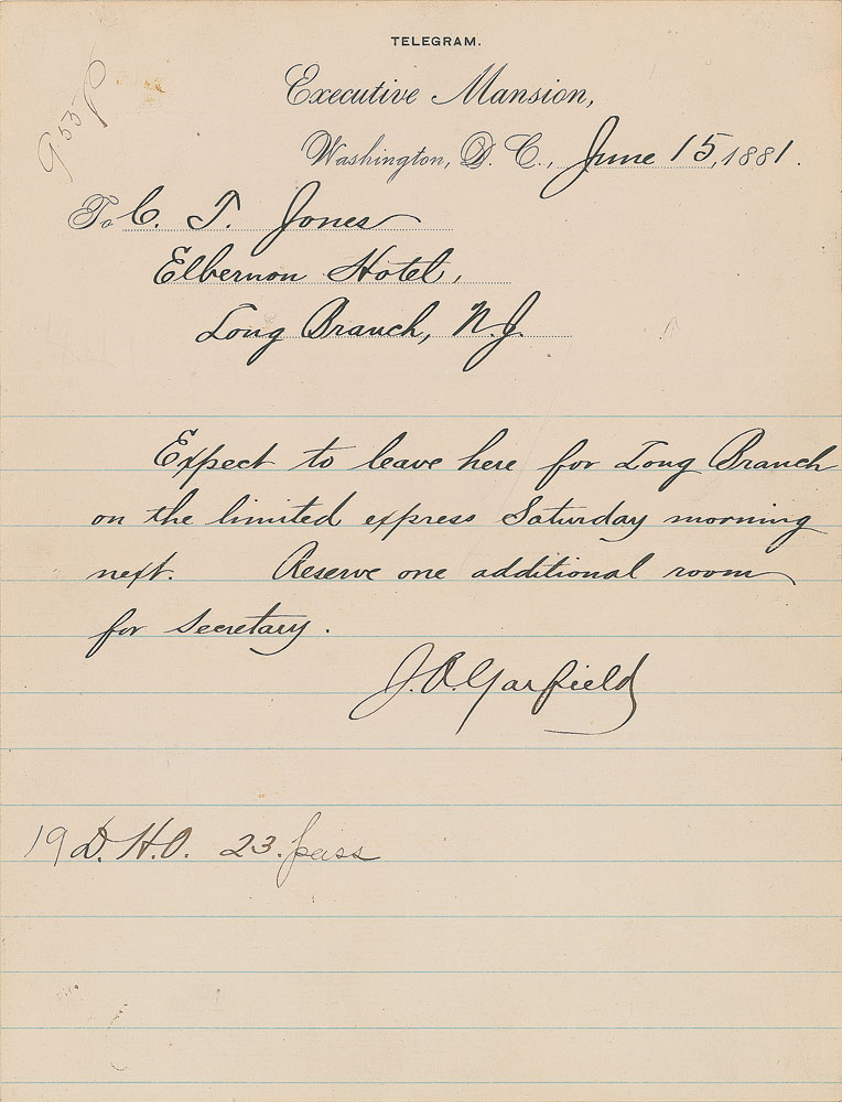 Sought-after LS signed as president, "J. A. Garfield," one page, lightly lined, 7.25 x 9.75, an Executive Mansion telegram, June 15, 1881. Addressed to C. T. Jones, the proprietor of the Elberon Hotel in Long Branch, New Jersey, in full: "Expect to leave here for Long Branch on the limited express Saturday morning next. Reserve one additional room for Secretary." In fine condition. After being diagnosed with malaria, Lucretia Garfield sought to recuperate at the coastal Elberon Hotel in mid-June 1881. Only weeks later, on July 2, it was there that the First Lady received news that her husband had been shot. Eager to escape the summer heat of the capital, Garfield returned to Elberon and moved into the Franklyn Cottage, a seaside mansion where physicians would continue to work on the dying president. Given how Garfield served in office for less than four months, presidential signatures remain rare and highly sought-after.