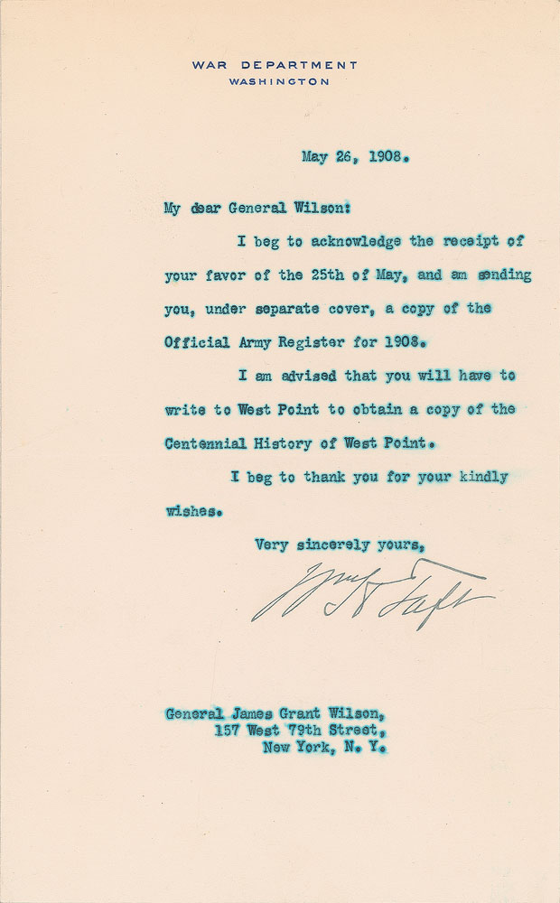 TLS signed “Wm. H. Taft,” one page, 5.5 x 9, War Department letterhead, May 26, 1908. Letter to James Grant Wilson, in full: "I beg to acknowledge the receipt of your favor of the 25th of May, and am sending you, under separate cover, a copy of the Official Army Register for 1908. I am advised that you will have to write to West Point to obtain a copy of the Centennial History of West point. I beg to thank you for your kindly wishes." In fine condition. Accompanied by the original mailing envelope.