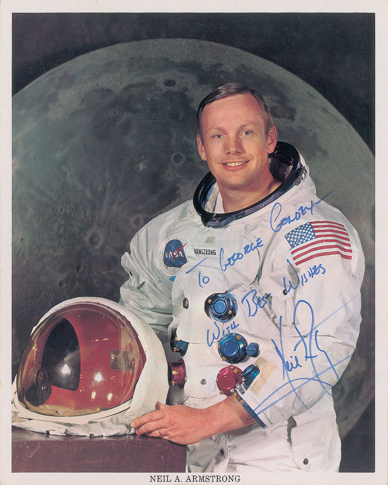 Official color 8 x 10 NASA lithograph of Armstrong posing in his white space suit against a large lunar backdrop, signed and inscribed in blue felt tip, "To George Goldey—with best wishes, Neil Armstrong.” In fine condition.