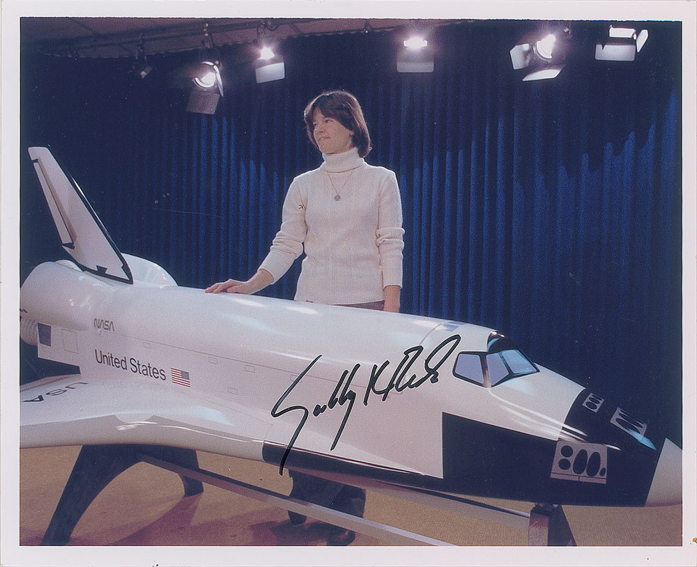 Fantastic color satin-finish 10 x 8.25 photo of Ride standing next to a large model of the Space Shuttle Challenger, signed in black felt tip, "Sally K. Ride." In fine condition.