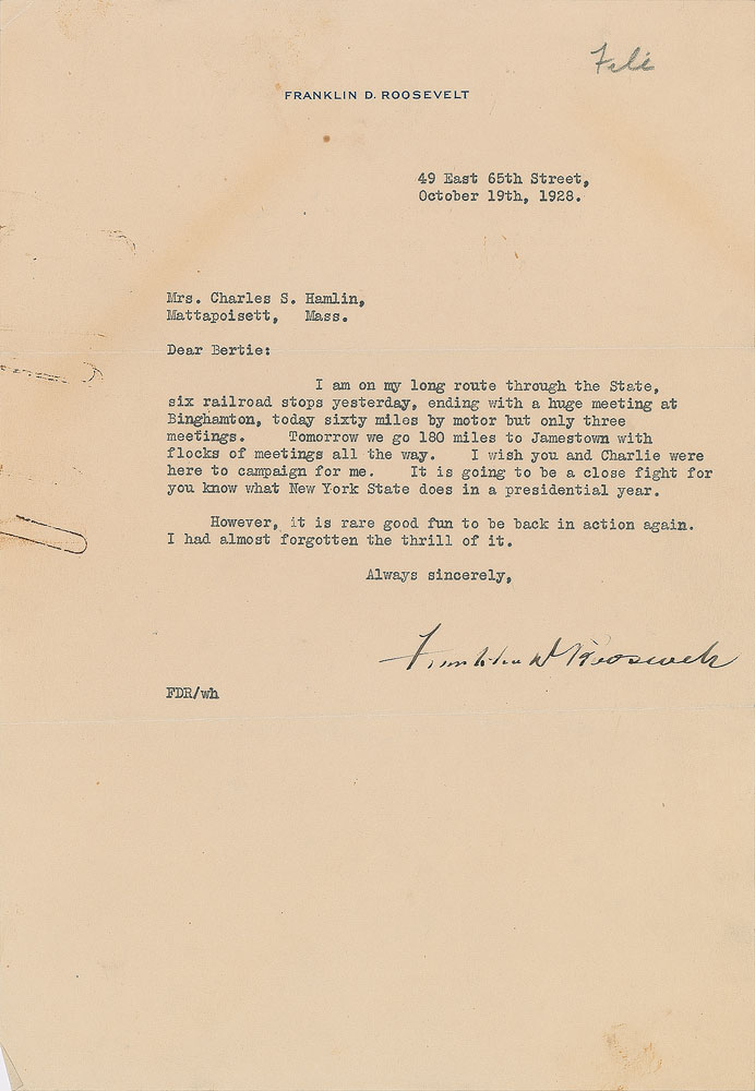TLS, one page, 7.25 x 10.5, personal letterhead, October 19, 1928. Letter to "Bertie," a childhood friend of Roosevelt and the wife of prominent Massachusetts lawyer and former Chair of the Federal Reserve Charles Sumner Hamlin, in full: "I am on my long route through the State, six railroad stops yesterday, ending with a huge meeting at Binghamton, today sixty miles by motor but only three meetings. Tomorrow we go 180 miles to Jamestown with flocks of meetings all the way. I wish you and Charlie were here to campaign for me. It is going to be a close fight for you know what New York State does in a presidential year. However, it is rare good fun to be back in action again. I had almost forgotten the thrill of it." In fine condition, with a few light stains, and two rusty paperclip marks along the left edge.