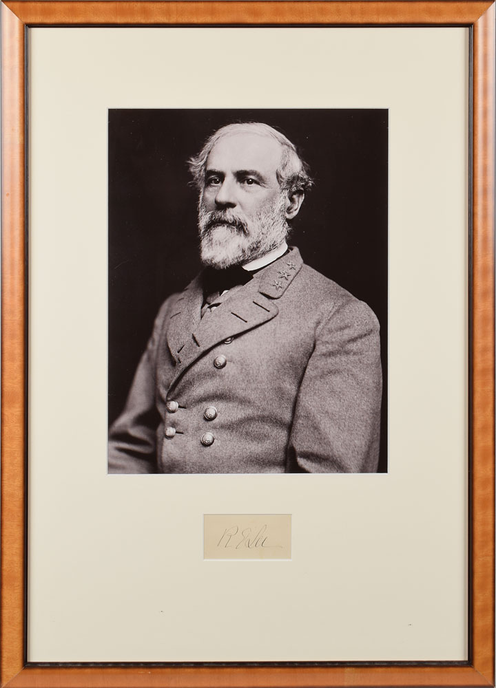 Crisp ink signature, "R. E. Lee,” on an off-white 3.25 x 1.5 sheet. Handsomely matted and framed with a portrait of Lee to an overall size of 18.25 x 25.25. In fine condition.