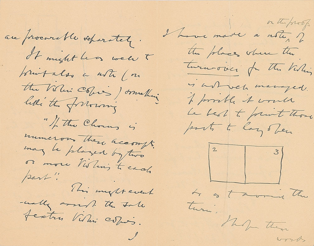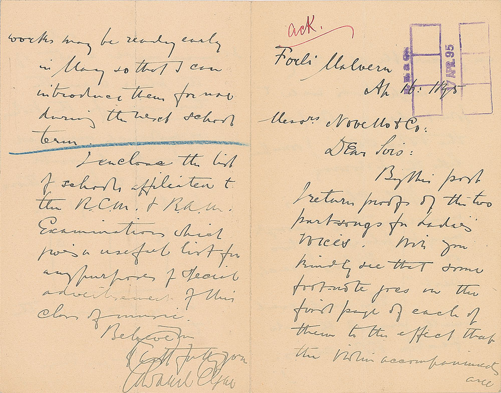 Leading English composer (1857-1934) and a significant figure among late Romantic European musicians. ALS, four pages on two adjoining sheets, 4.5 x 7, April 16, 1895. Letter to Lois of Novello and Co., in part: "By this post I return proofs of the two part songs for Ladies' voices. Will you kindly see that some footnote goes in the first page of each of them to the effect that the violin accompaniments are procurable separately. It might be as well to print also a note (on the violin copies) something like the following: 'If the chorus is numerous these accomps. may be played by two or more violins to each part.'" Elgar adds a sketch of the second and third pages of the proposed proof. In fine condition.