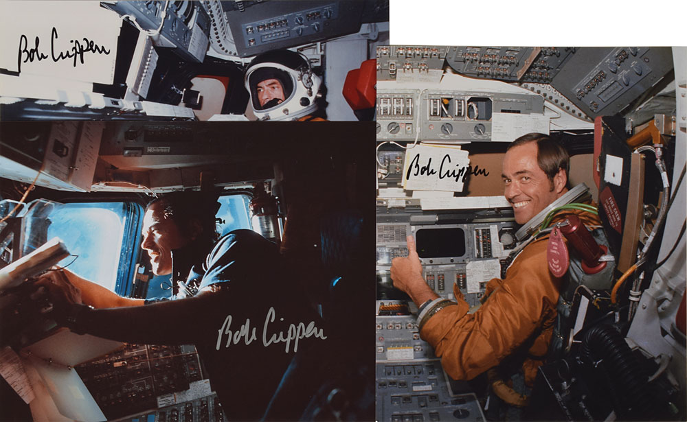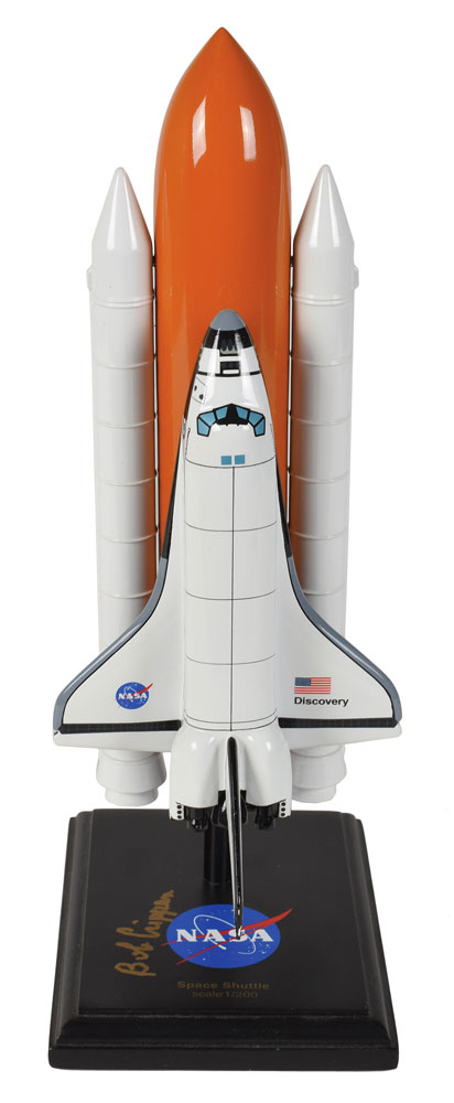 Four items: an attractive 1:200 scale model of the Space Shuttle Discovery, measuring approximately 13″ tall and set on a wooden 4.5 x 6 base, which is signed in gold ink by Bob Crippen; and a set of three color semi-glossy photos of Crippen from inside the Space Shuttle flight deck, 8 x 10 and 10 x 8, each signed in black felt tip or silver ink, with the reverse of two bearing affixed labels from the Astronaut Scholarship Foundation certifying that the autographs were signed for the organization. In overall fine condition.