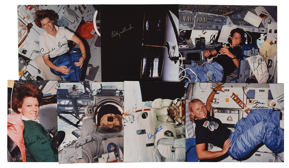 Collection of seven color semi-glossy or satin-finish photos, 8 x 10 and 10 x 8, each signed by an American female astronaut in ink or felt tip, including: Sally Ride, Rhea Seddon, Kathy Thornton (3), and Eileen Collins (2). In overall fine condition.