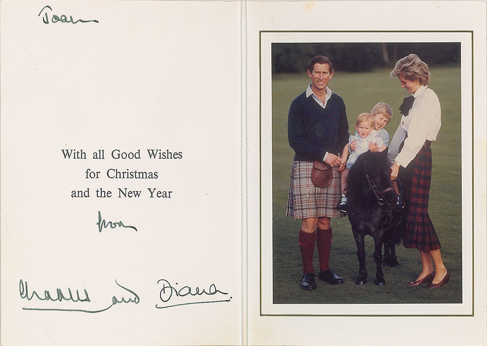 Circa 1985 Christmas card embossed with the Prince of Wales’s feathers and Order of the Garter motto and the Spencer family arms, measuring 10.25 x 7.25 open, featuring an affixed color photo of the royal couple with their two children atop a Shetland pony, signed and inscribed on the adjacent page in fountain pen, “Joan, from Charles and," and in black ink, "Diana.” In fine condition.