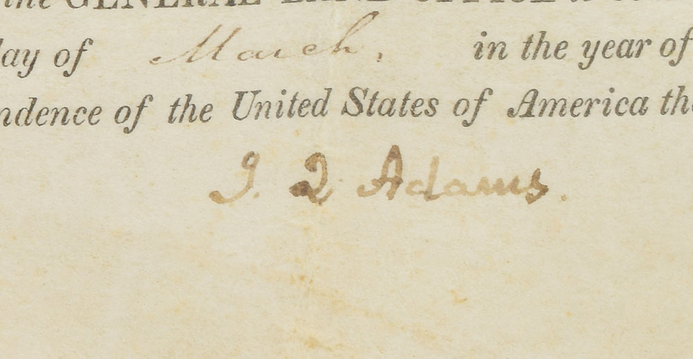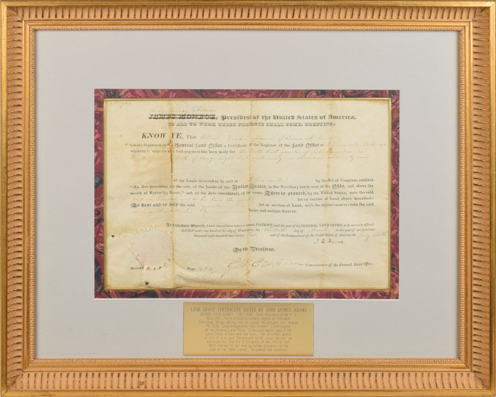 Partly-printed vellum DS as president, signed “J. Q. Adams,” one page, 13.25 x 8.75, March 30, 1825. President Adams grants William Rankin, "assigned by James M. Broom," a parcel of land in Jeffersonville, Indiana, "containing one Hundred and sixty acres." Signed at the conclusion by President Adams and countersigned by Commissioner of the General Land Office George Graham. The white paper seal remains affixed to lower left corner. Triple-matted and framed with a descriptive plaque for a different document to an overall size of 22.75 x 18.25. In very good to fine condition, with moderate overall rippling, and a tear and some paper loss along one of the folds.