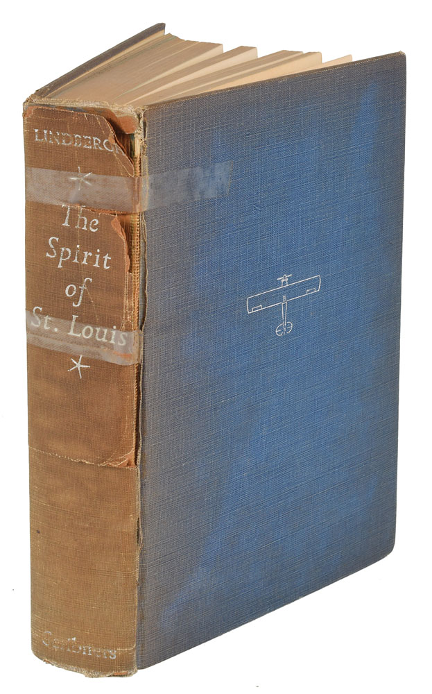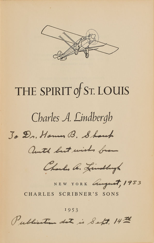 Signed book: The Spirit of St. Louis. First edition. NY: Charles Scribner's Sons, 1953. Clothbound hardcover, 5.75 x 8.5, 562 pages. Signed and inscribed on the title page in black ink, "To Dr. Homer B. Shoup, with best wishes from Charles A. Lindbergh, August, 1953, Publication date is Sept. 14th." Autographic condition: fine. Book condition: G+/None, with crudely repaired tears to spine; the binding is tight and interior pages are clean. Shoup was the family doctor of the Lindbergh family.