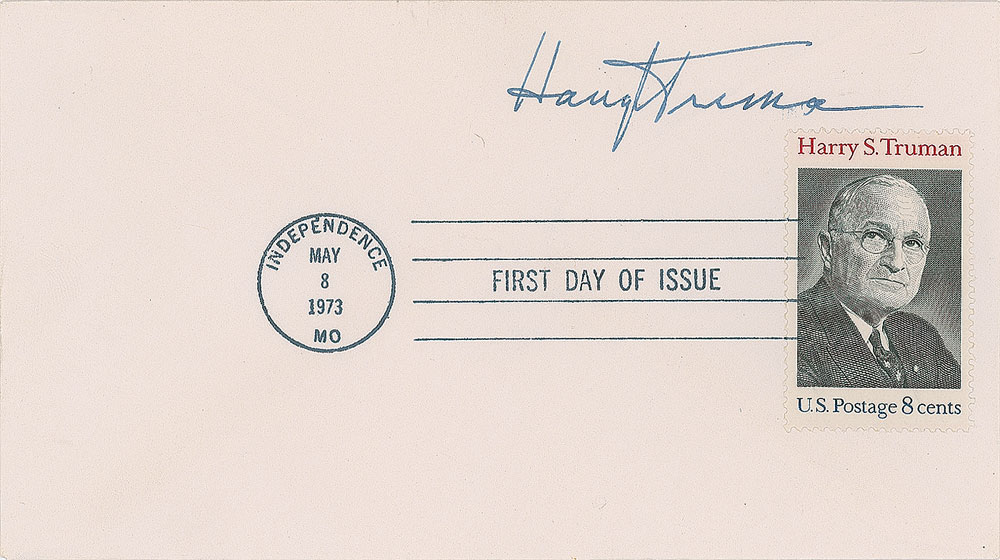 Victory in Europe Day FDC postmarked at Independence, Missouri, on May 8, 1973, exactly 28 years after Truman announced on radio that Nazi Germany’s forces had surrendered, signed in fountain pen by Truman. In very fine condition.