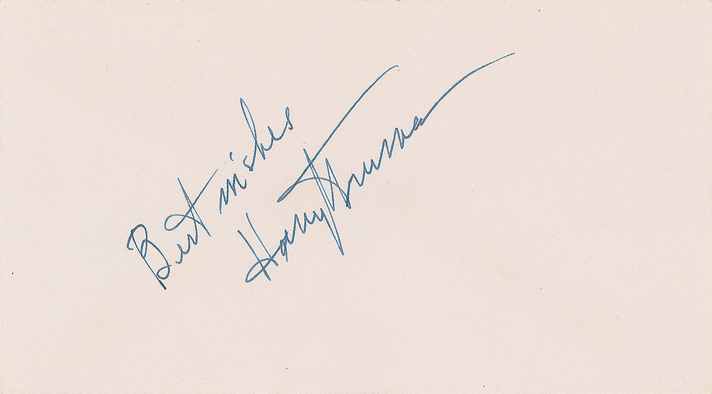 Mailing envelope, 6.5 x 3.5, signed in black ink, "Best wishes, Harry S. Truman." Also includes a mailing envelope signed in black ink by Dean Acheson, secretary of state during the Truman administration. In very fine condition.