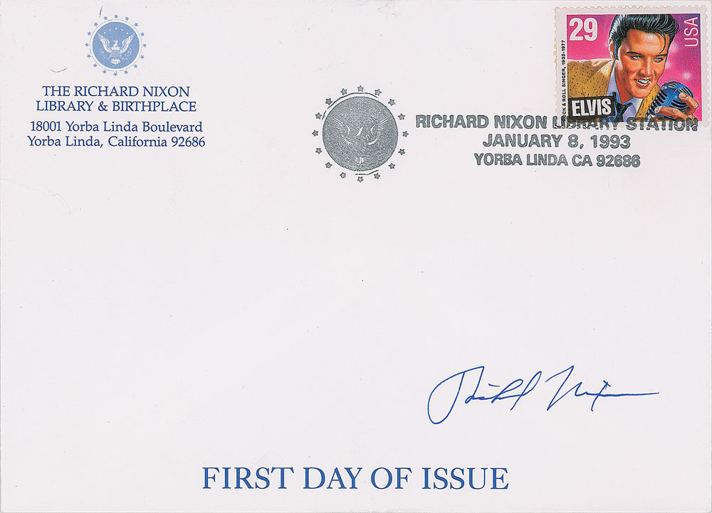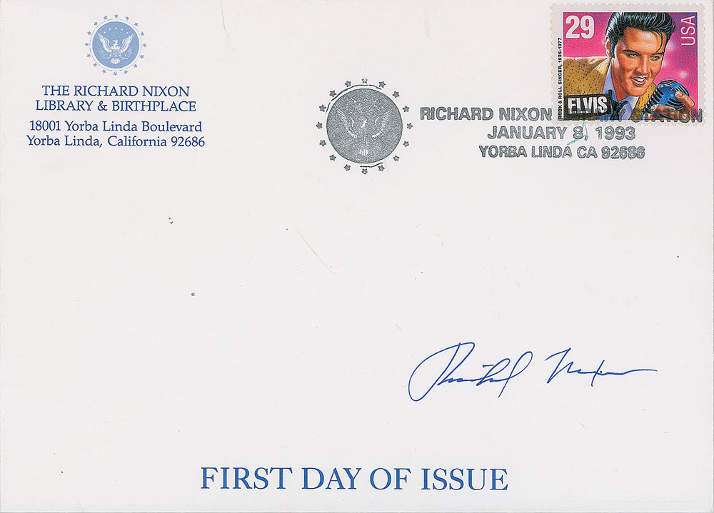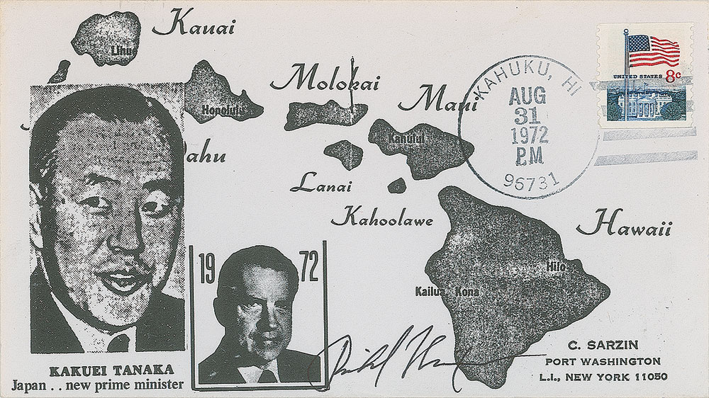 Three items: two Richard Nixon Library FDCs postmarked January 8, 1993, both 7.25 x 5.25, signed in blue ink by Nixon; and a mailing envelope with a design honoring President Nixon's meeting with Japanese Prime Minister Kakuei Tanaka in Hawaii, postmarked August 31, 1972, signed in black ink by Nixon. In overall very fine condition.