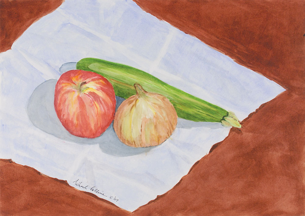 Charming original watercolor painting of fruits and vegetables on a table, 20 x 14, signed in black ink, “Michael Collins I ’07.” In condition. A rare chance to own artwork from a legendary Apollo astronaut.