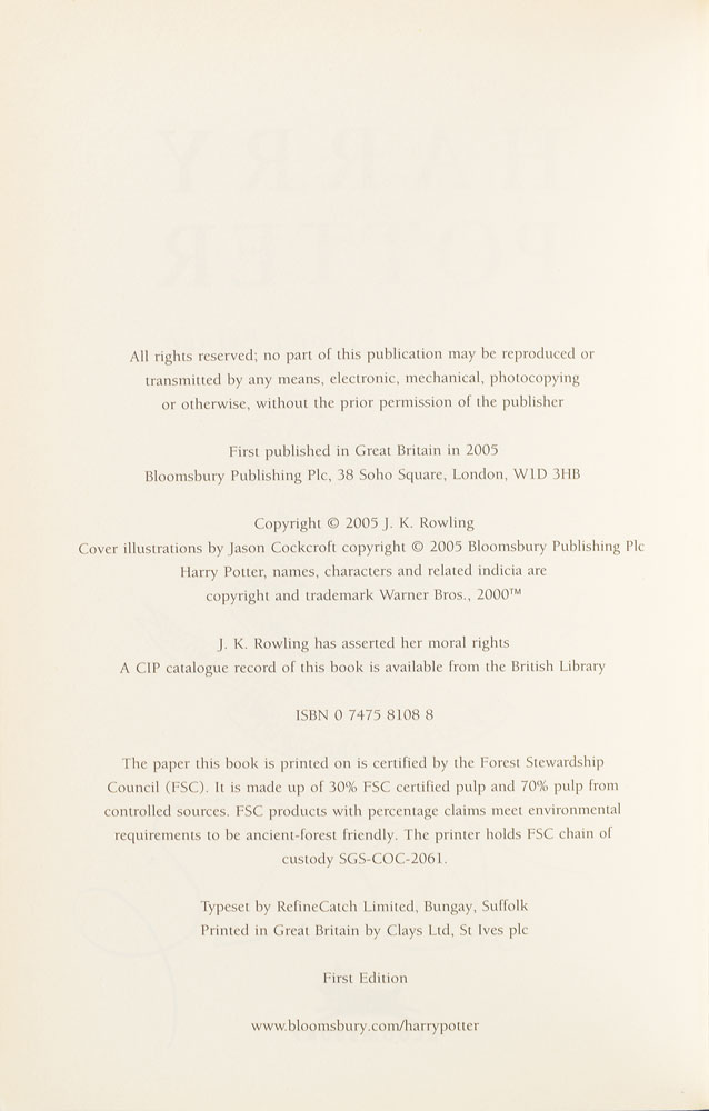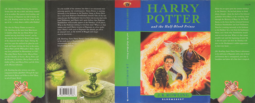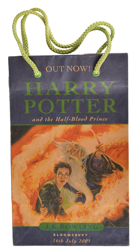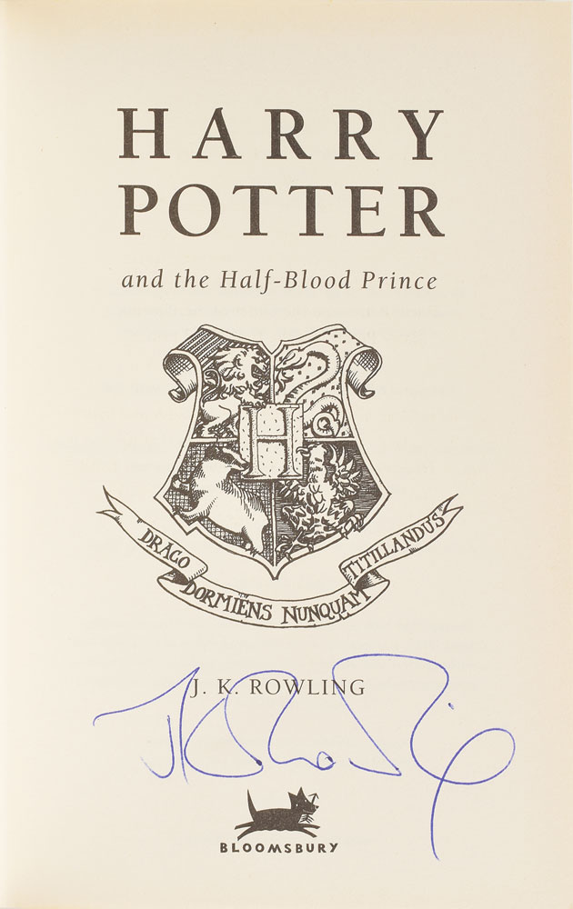 Signed book: Harry Potter and the Half-Blood Prince. First edition. London: Bloomsbury, 2005. Hardcover with dust jacket, 5.25 x 8, 607 pages. Boldly signed on the title page in blue ballpoint, "J. K. Rowling." In fine condition. Accompanied by the original Bloomsbury paper bag from the July 16, 2005, release date, and three lighting bolt temporary tattoos.
