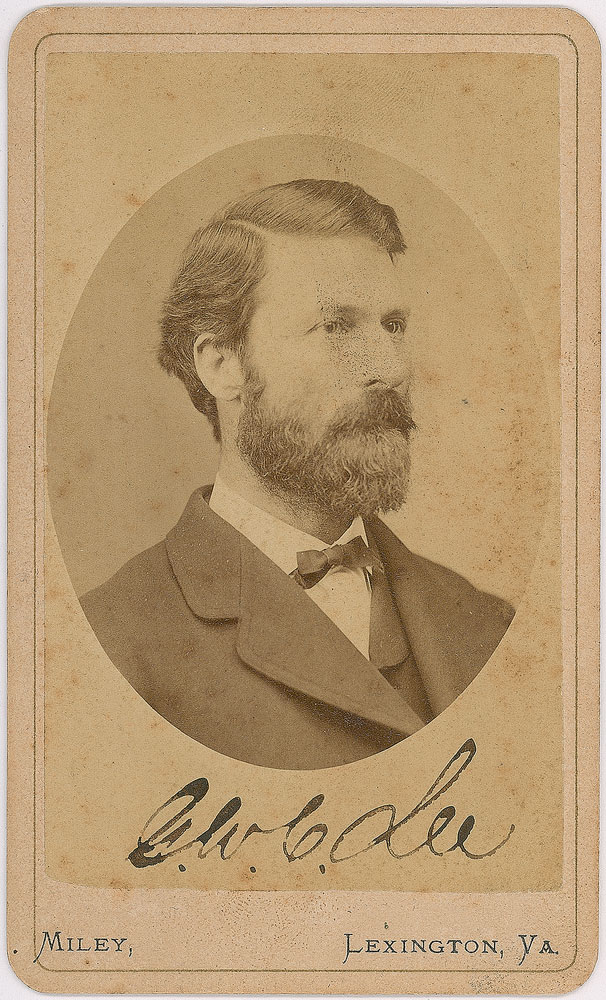 Eldest son of Robert E. Lee, who served as a Confederate general and aide-de-camp to Jefferson Davis (1832-1913). Uncommon 2.5 x 4 carte-de-visite portrait of Lee, signed in black ink, "G. W. C. Lee." Published by the Miley Studio of Lexington, Virginia. In fine condition, with scattered light foxing.