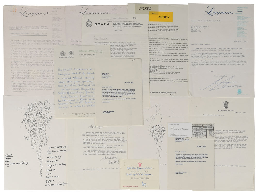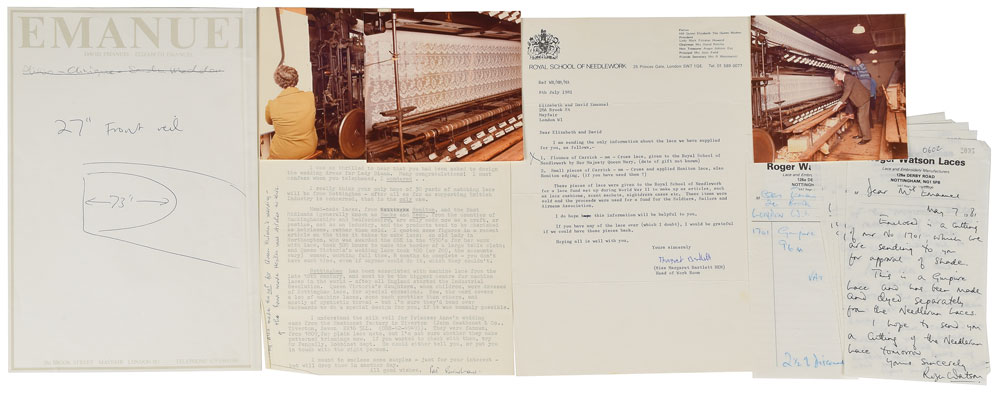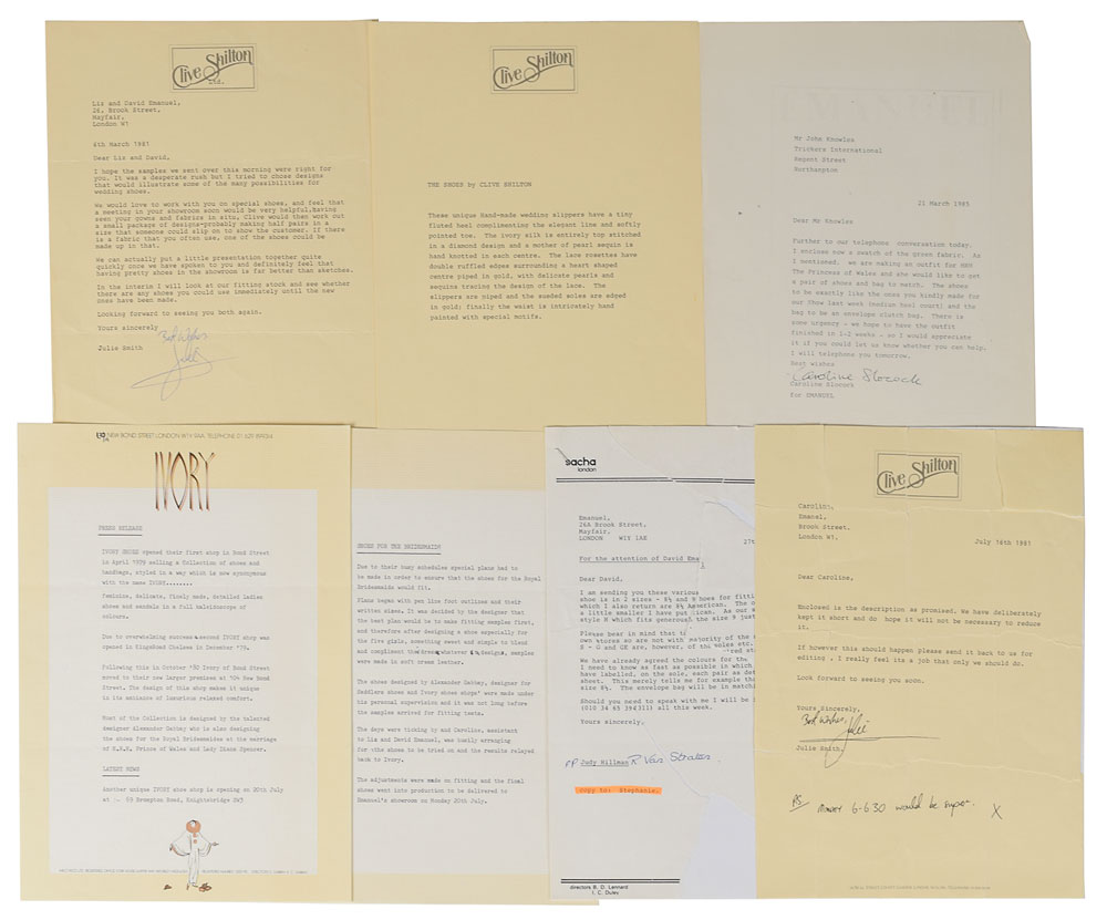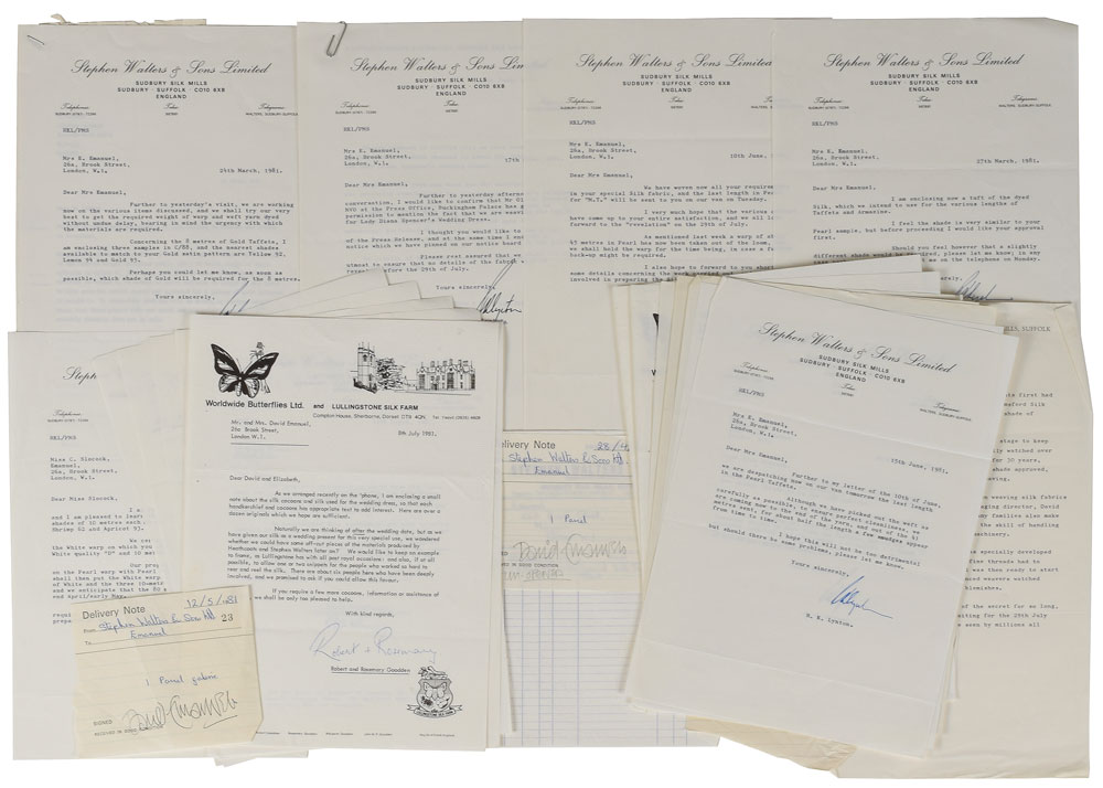 Significant archive of correspondence between Princess Diana’s wedding dress designers David and Elizabeth Emanuel and the vendors involved in the production of the iconic dress, including letters about the fabrics, shoes, flowers, lace, and embroidery. Includes: