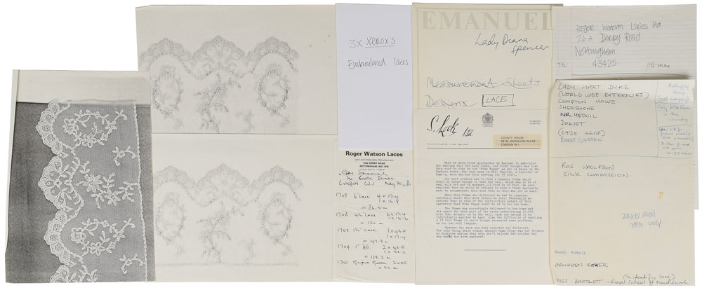 Ten pages related to the lace, including letters from the manufacturer, Roger Watson Laces, and a letter from the Royal School of Needlework concerning the historical lace once owned by Queen Mary that was incorporated into Diana’s dress, plus a few small sample swatches.