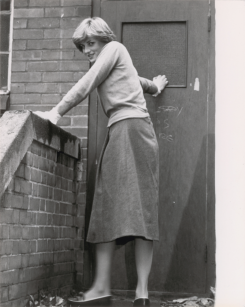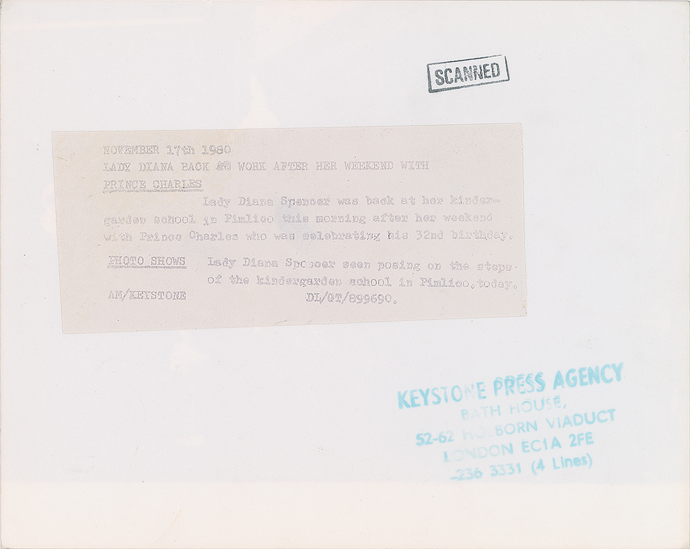 Original vintage 1980 glossy 8 x 10 silver gelatin photo of Lady Diana Spencer posing on the steps of the Young England Kindergarten where she worked on November 17, 1980, after spending the weekend celebrating Prince Charles's 32nd birthday. Reverse bears a Keystone Press Agency credit stamp and affixed caption. In fine condition. A striking image capturing both Diana's 'common schoolteacher' image and her playfulness with the press. From the Globe Photo archives.