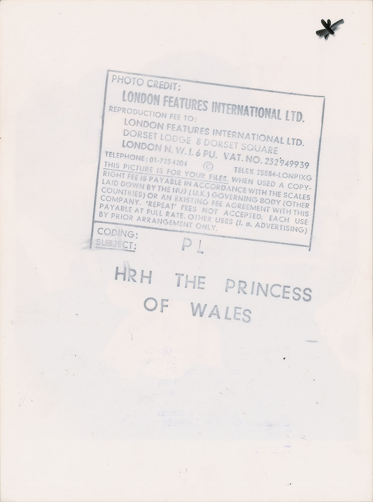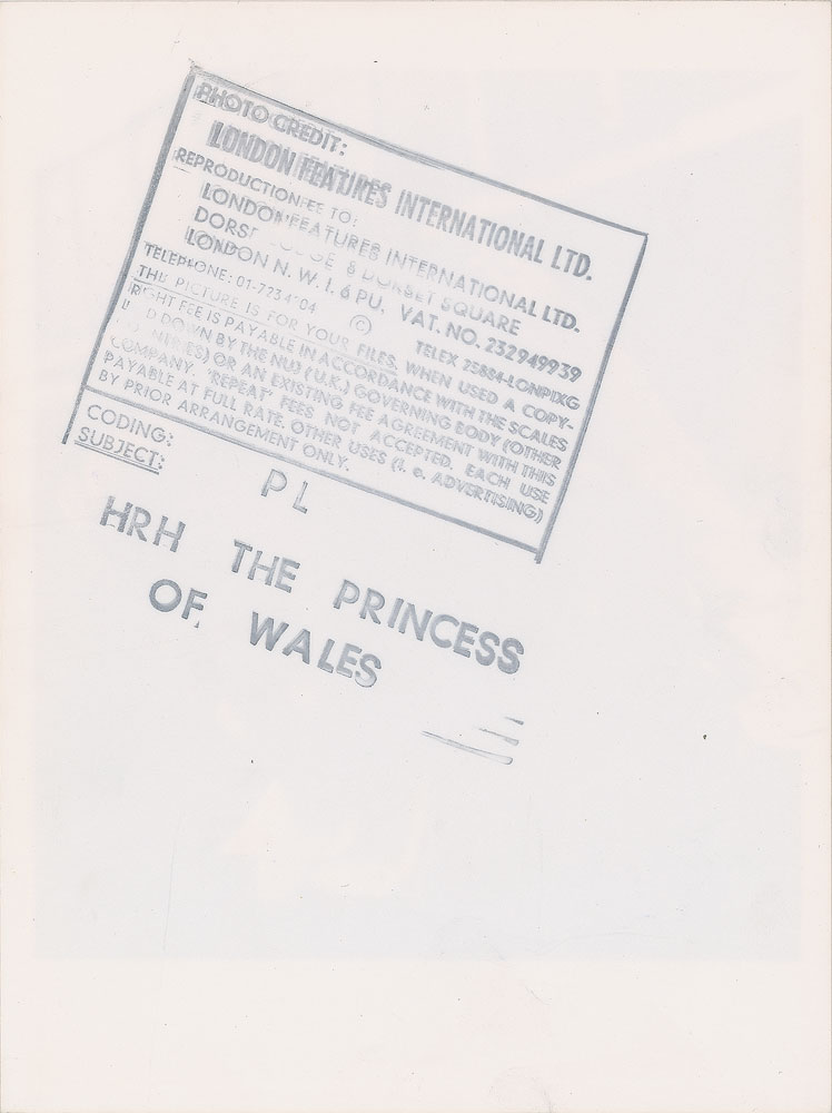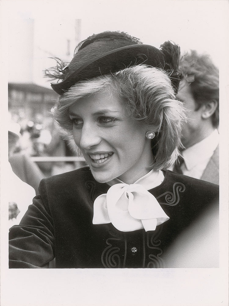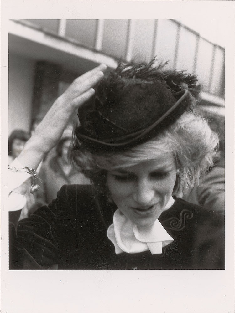 Two beautiful original vintage early 1980s glossy 6 x 8 silver gelatin photos of Diana wearing a feathered cap, showing her in two slightly different close-up poses. Both bear London Features International credit stamps on the reverse. In overall fine condition, with a crease to the top of one. From the Globe Photo archives.