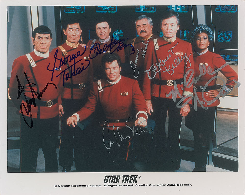 Color glossy 10 x 8 Paramount Pictures publicity photo showing the cast of the 1991 film Star Trek VI: The Undiscovered Country, signed in silver ink by William Shatner, James Doohan, DeForest Kelley, and Nichelle Nichols, and in blue felt tip by George Takei and Walter Koenig, and in black felt tip by Leonard Nimoy. In fine condition.