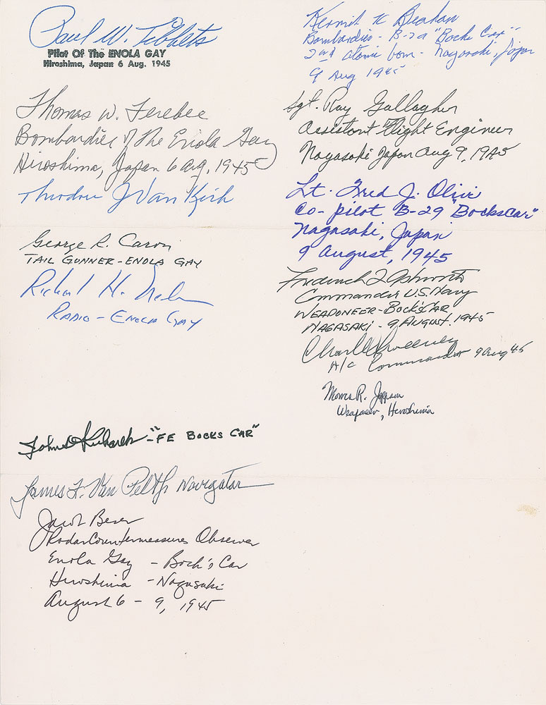 Ink signatures of fourteen crew members of the Enola Gay and Bock's Car on a white 8.5 x 11 sheet, most adding their assignments, including: Paul W. Tibbets, Thomas W. Ferebee, Dutch Van Kirk, George R. Caron, Richard H. Nelson, John D. Kuharek, James F. Van Pelt, Jr., Jacob Beser, Kermit K. Beahan, Ray Gallagher, Fred J. Olivi, Frederick J. Ashworth, Charles W. Sweeney, and Morris R. Jeppson. In fine condition, with two horizontal folds.