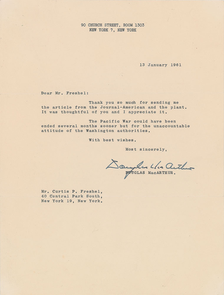 TLS, one page, 8 x 10.5, January 13, 1961. Letter to Curtis P. Freshel, in part: "The Pacific War could have been ended several months sooner but for the unaccountable attitude of the Washington authorities." In fine condition.