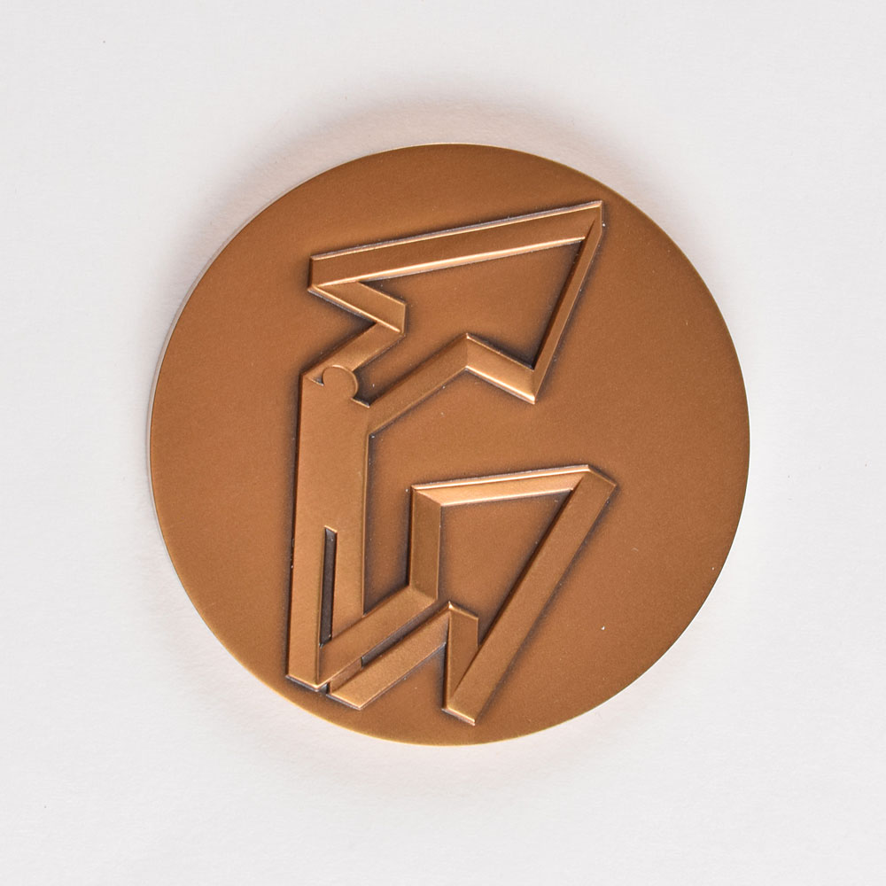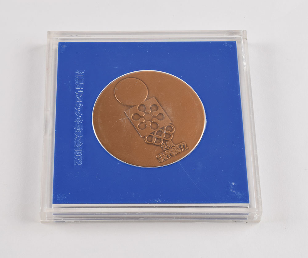 Participation medal issued for the Sapporo 1972 Winter Olympics. Bronze, 60 mm, 136 gm, by Shigeo Fukuda. The front depicts the Sapporo Olympic emblem; the reverse features a stylized athlete with arrows on his arms and legs. Complete with its clear plastic case.