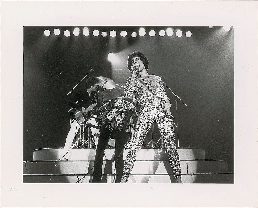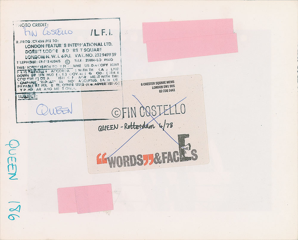 Original vintage satin-finish 9.75 x 8 silver gelatin photo of Queen on stage in Rotterdam in 1978, showing Freddie Mercury in a dazzling outfit during one of his powerful performances. Reverse bears a London Features International credit stamp and Fin Costello copyright label. In fine condition. Fin Costello is an Irish photographer who has worked with many of the greatest names in the industry, including the Rolling Stones, Jimi Hendrix, KISS, Deep Purple, and Duran Duran. London Features International was a London-based photo agency that started in the 1960s, and licensed photographs to magazines and newspapers for publication.