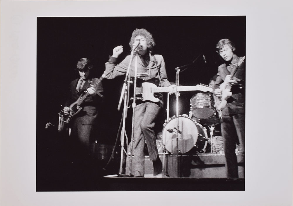 Rare 11.75 x 8.25 digital print of an original photograph of Bob Dylan and The Band on stage at the Manchester Free Trade Hall, on May 17, 1966, taken by the 16-year-old Mark Makin and annotated with Makin’s credit on the reverse. In very fine condition. This was the legendary show at which a heckler yelled “Judas” at Dylan for having played with an electric band, and which was famously (and mistakenly) bootlegged as ‘The Royal Albert Hall’ concert. Consignor notes that this was obtained from the archives of a stock photo agency, which licensed photographs to magazines and newspapers on behalf of photographers. Makin’s photographs of Dylan and The Band are the only images to ever surface of this legendary show.