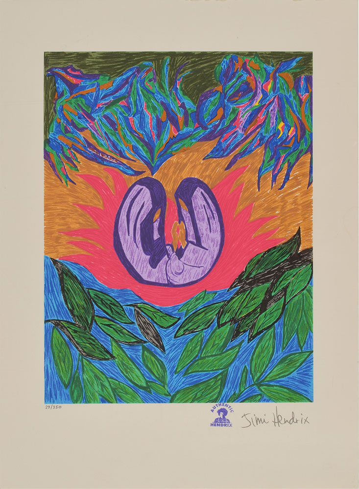 Attractive limited edition 24-color serigraph, 14.75 x 21, numbered 29/350, entitled ‘The Prayer,’ printed on Lana Aquarelle Arches paper, bearing Hendrix’s printed signature in the lower border, as well as an official Hendrix estate stamp. Rolled and in very fine condition.